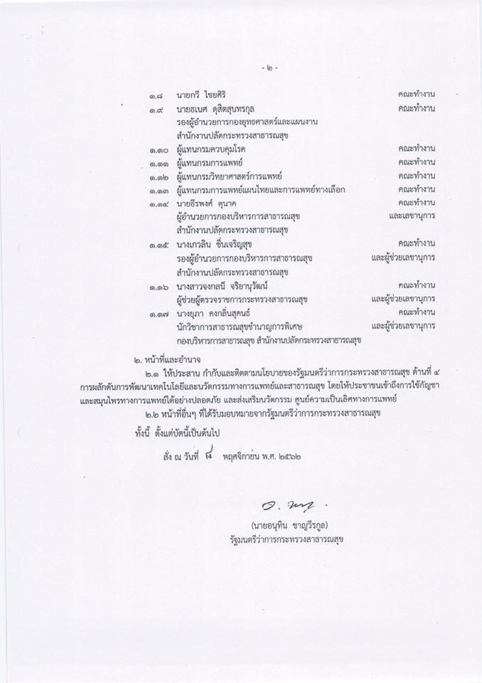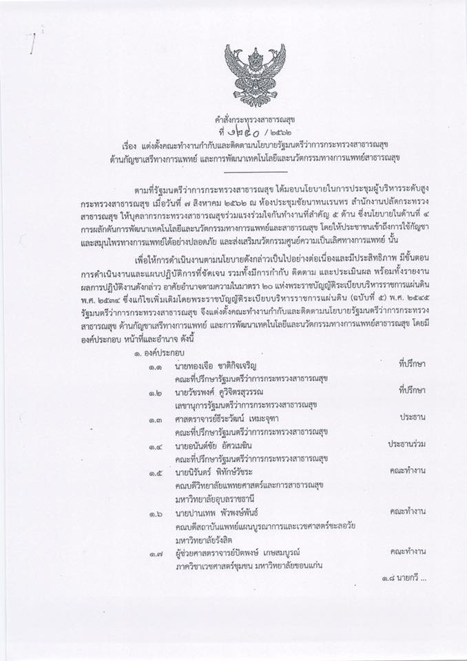 ที่ 1250/2562 เรื่อง แต่งตั้งคณะทํางานกํากับและติดตามนโยบายรัฐมนตรีว่าการกระทรวงสาธารณสุข ด้านกัญชาเสรีทางการแพทย์ และการพัฒนาเทคโนโลยีและนวัตกรรมทางการแพทย์สาธารณสุข