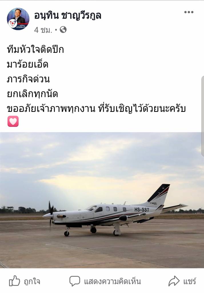 “เช้าวันเสาร์ และเช้าวันอาทิตย์ แม้เป็นวันหยุด คุณอนุทิน ชาญวีรกูล รองนายกรัฐมนตรีและรัฐมนตรีว่าการกระทรวงสาธารณสุข ขับเครื่องบินและค่าใช้จ่ายส่วนตัว รับอวัยวะมาช่วยชีวิตผู้ป่วย ด้วยภาระกิจ หัวใจติดปีก มาก่อนเรื่องส่วนตนด้วยการเดินทางพร้อมทีมแพทย์ และยังไปกราบขอบพระคุณญาติๆผู้ป่วยด้วยความอ่อนน้อม....