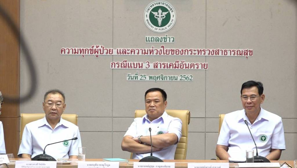 ด้านนายแพทย์สุขุม กาญจนพิมาย ปลัดกระทรวงสาธารณสุข กล่าวว่า การใช้สารเคมีอันตรายทั้ง 3 ชนิด เกิดผลกระทบต่อสุขภาพแก่ประชาชนอย่างมากมาย ดังเช่นผู้ป่วยที่มีการรายงาน รวมทั้งมีผลกระทบต่อประชากรรุ่นใหม่ของประเทศ จุดยืนกระทรวงสาธารณสุขคือสนับสนุนการยุติการใช้สารเคมีที่เป็นอันตรายต่อสุขภาพทั้ง 3 ชนิด เพื่อสุขภาพที่ดีขึ้นของคนไทย
