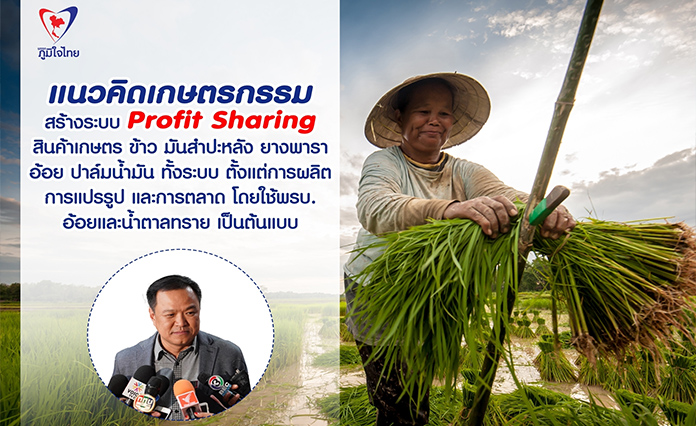 พรรคภูมิใจไทย มีแนวคิดที่จะสร้างระบบแบ่งปันผลประโยชน์ ให้แก่ผลผลิตภาคเกษตรกรรมของประเทศ ได้แก่ ข้าว ยาง มันสำปะหลัง และ อ้อย โดยนำตัวอย่างจาก อุตสาหกรรมอ้อยและน้ำตาล มาเป็นต้นแบบ