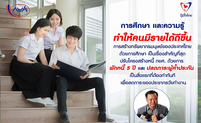 พรรคภูมิใจไทย เห็นว่า การปรับโครงสร้างหนี้ กยศ. ซึ่งมีผู้กู้ 5 ล้านคน มีผู้ค้ำประกัน 2 รายต่อคน รวมมีผู้เกี่ยวข้อง 15 ล้านคน มีหนี้อยู่ในระบบทั้งสิ้นประมาณ 4 แสนล้านบาท คนกลุ่มนี้ เป็นหนี้ตั้งแต่ก้าวเท้าแรกออกจากรั้วสถาบันการศึกษา ยังไม่ทันได้ตั้งเนื้อตั้งตัว บางคนเรียนจบมาไม่มีงานทำ เพราะตลาดงานเปลี่ยนไป มีการใช้เทคโนโลยีเข้ามาทดแทนแรงงาน ซึ่งในอนาคตอันใกล้นี้อัตราการจ้างงานจะยิ่งลดลงไปอีกเรื่อย ๆ