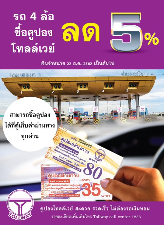 ในส่วนของดอนเมืองโทลล์เวย์ จัดทําคูปองลด 5% เพื่อใช้จ่ายค่าผ่านทางดอนเมืองโทลล์เวย์ เพื่อช่วยลดภาระค่าใช้จ่ายประชาชน โดยคูปอง 1 ชุดมี 20 ใบ มูลค่า 1,520 บาท สําหรับค่าผ่านทาง 80 บาท (ราคาเต็ม 1,600 บาท) และมูลค่า 665 บาท สําหรับค่าผ่านทาง 35 บาท (ราคาเต็ม 700 บาท) ซึ่งสามารถซื้อคูปองได้ที่ตู้เก็บเงินค่าผ่านทางทุกตู้ทุกด่าน (เริ่มจําหน่าย 22 ธ.ค. 2562 เป็นต้นไป) โดยมาตรการคูปองลดราคานั้น ระยะเวลา 6 เดือน หากซื้อคูปองแล้วสามารถใช้ได้ 5 ปี ขณะที่ องค์การขนส่งมวลชนกรุงเทพ (ขสมก.) ลดภาระค่าโดยสารให้แก่ผู้ถือบัตรโดยสารอิเล็กทรอนิกส์ (บัตรโดยสาร ราคา 50 บาท ซึ่งมีจำหน่ายเฉพาะบนรถโดยสาร) และที่นำบัตรมาใช้ชำระค่าโดยสาร แบ่งเป็น รถโดยสารปรับอากาศ (รถแอร์) ลดราคา 10% และรถโดยสารธรรมดา (รถร้อน) ลดราคา 5% ตั้งแต่วันที่ 1 ธ.ค.2562 - 31 ม.ค. 2563 รวมระยะเวลา 2 เดือน
