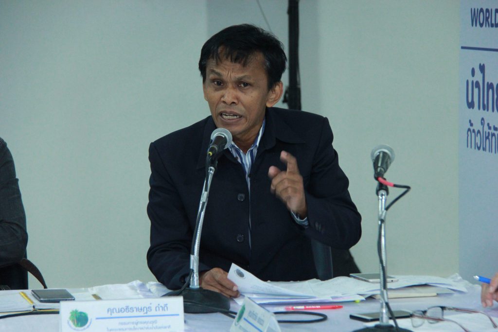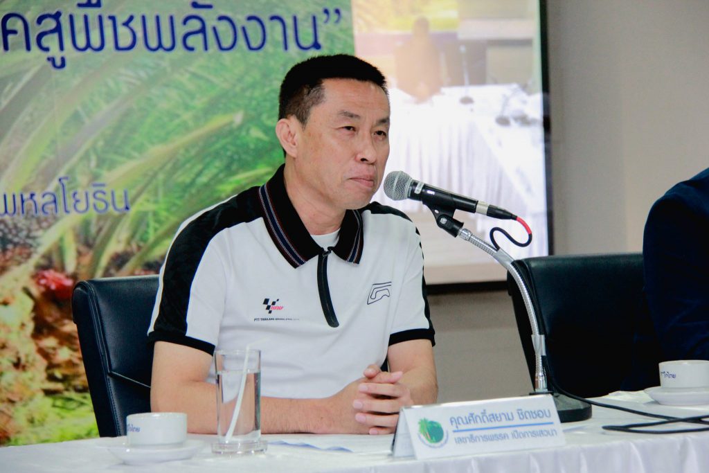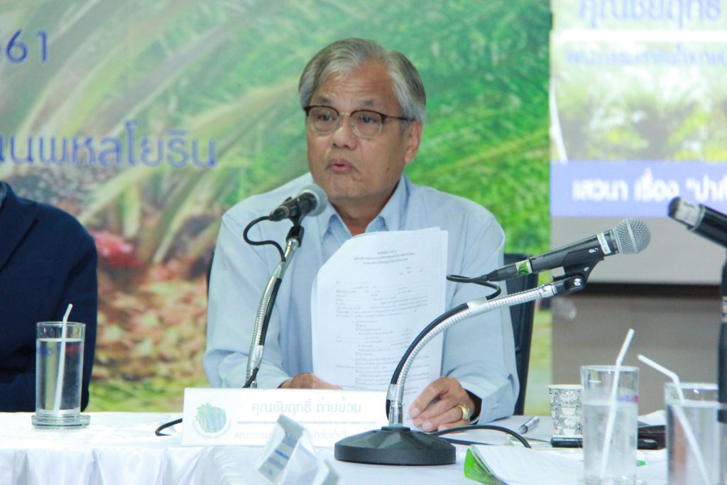 ด้านนายชัยฤทธิ์ ถ่ายย้วน คณะกรรมการนโยบายปาล์มน้ำมันแห่งชาติ กล่าวว่าผู้เกี่ยวข้องกับ ปาล์มน้ำมัน 2.2 แสนครัวเรือน หรือ 1 ล้านคนนั้น เป็นเพียงแค่ต้นน้ำ แต่ถ้ารวมทั้งระบบที่เกี่ยวข้องจะมีคนประมาณ 2 ล้านคน ซึ่งรวมถึง กลางน้ำและปลายน้ำ การนำปาล์มน้ำมันมาใช้ผลิตกระแสไฟฟ้า สามารถที่จะช่วยเหลือเกษตรกรชาวสวนปาล์มได้ และเป็นพลังงานสะอาด และการใช้ ผลประโยชน์แบ่งปัน จะเป็นโมเดล ในการแก้ไขปัญหา แต่ภาครัฐต้องเข้ามา เป็นมติใหม่ในการสร้างความมั่นคง มั่งคั่ง และ ยั่งยืน ให้กับเกษตรกร