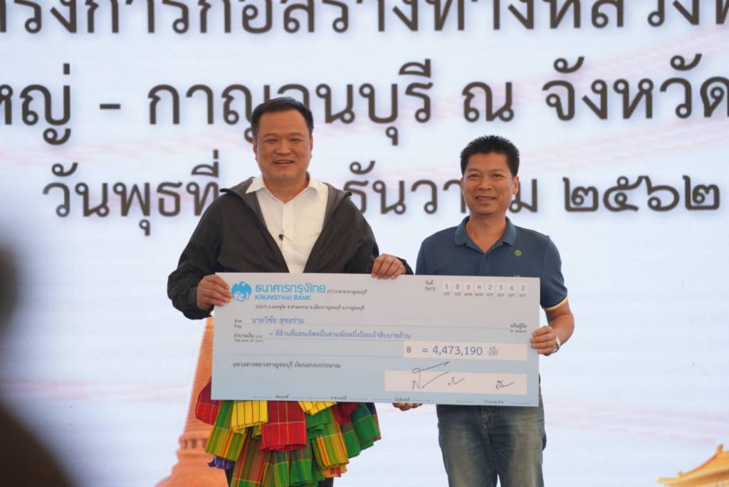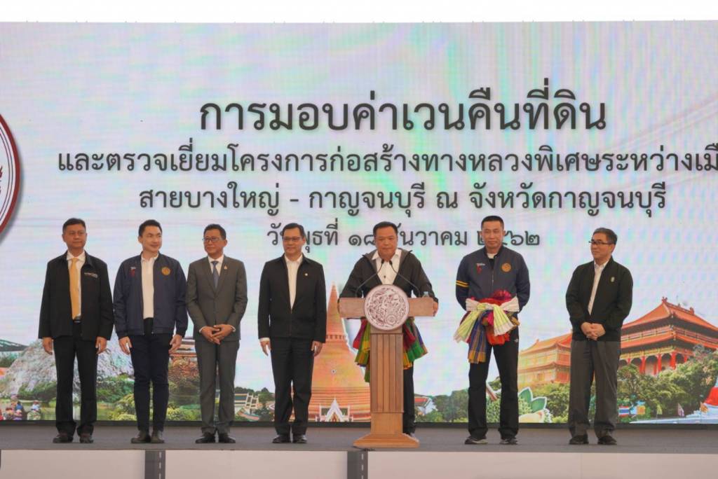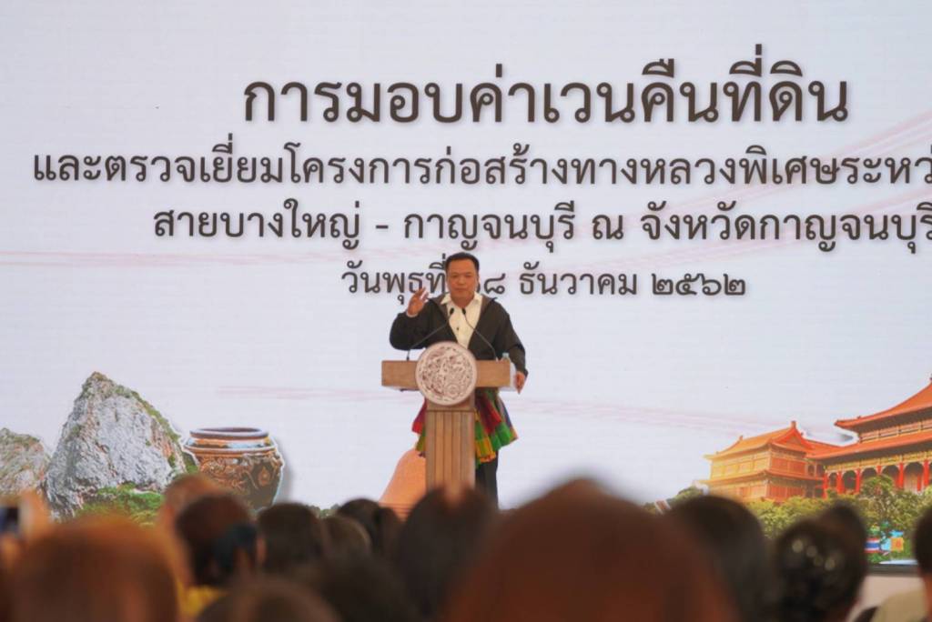 18 ธันวาคม 2562 เวลา 16:46"รองนายกฯ อนุทิน" ชู อนาคตที่ดินจะราดด้วยทองไม่ใช่ด้วยคอนกรีต"รองนายกฯ อนุทิน" ชู อนาคตที่ดินจะราดด้วยทองไม่ใช่ด้วยคอนกรีต ขอบคุณประชาชนที่เสียสละส่วนรวมและประเทศชาติ ตรวจโครงการมอเตอร์เวย์ และจ่ายค่าเวนคืน บางใหญ่ - กาญจนบุรี กดปุ่มรีสตาร์ท เปิดหวูด เดินเครื่องจักรทันที วันที่ 18 ธันวาคม พ.ศ.2562 นายอนุทิน ชาญวีรกูล รองนายกรัฐมนตรี และรัฐมนตรีว่าการกระทรวงสาธารณสุข นายศักดิ์สยาม ชิดชอบ รัฐมนตรีว่าการกระทรวงคมนาคม และนายสราวุธ ทรงศิวิไล อธิบดีกรมทางหลวง เป็นประธานมอบค่าเวนคืนที่ดิน และตรวจเยี่ยมโครงการก่อสร้างทางหลวงพิเศษระหว่างเมือง สายบางใหญ่-กาญจนบุรี บริเวณตอนที่ 20 ตำบลตะคร้ำเอน อำเภอท่ามะกา จังหวัดกาญจนบุรี โดยมีประชาชนที่จะได้รับค่าเวนคืนทั้งหมด ประกอบไปด้วยจังหวัดกาญจนบุรี มี 689 ราย และจังหวัดราชบุรี มี 123 ราย รองนายกฯ อนุทิน ได้กล่าวขอบคุณประชาชนที่ได้รับผลกระทบจากการเวนคืนที่ดินที่ได้เสียสละให้กับประโยชน์ส่วนรวมของประเทศ ทำให้รัฐบาลสามารถดำเนินโครงการก่อสร้างทางหลวงพิเศษระหว่างเมือง หมายเลข 81 สายบางใหญ่-กาญจนบุรี ซึ่งเป็นโครงการที่สำคัญในการพัฒนาคุณภาพชีวิต ความเป็นอยู่ในภูมิภาคให้ดีขึ้น สำหรับอนาคตของประเทศไทย ไม่เฉพาะเป็นการการเดินทางเชื่อมต่อระหว่างภูมิภาค ตะวันตก มาภาคกลาง และกรุงเทพมหานคร แต่เป็นประโยชน์กับประชาชนภาคเกษตรกรรม อุตสาหกรรม และท่องเที่ยว ที่จะสามารถสร้างงาน สร้างรายได้ สร้างความ มั่นคง มั่งคั่ง ให้กับประชาชนในพื้นที่ ซึ่งเป็นไปตามยุทธศาสตร์ชาติ ต่อไปได้ ในส่วนของการดำเนินการพัฒนาโครงการต่างๆ รัฐบาลได้คำนึงถึง ผู้มีส่วนได้เสียจากการก่อสร้าง และมีมาตรการในการเยียวยาอย่างรอบด้าน เพื่อให้มีผลกระทบในด้านต่างๆ น้อยที่สุด สำหรับการดำเนินการ โครงการก่อสร้างทางหลวงพิเศษระหว่างเมือง หมายเลข 81 สายบางใหญ่ - กาญจนบุรี นั้น รัฐบาลมีความห่วงใย ต่อพี่น้องประชาชนผู้ถูกเวนคืนที่ดิน โดยถือว่าทุกท่านเป็นผู้เสียสละ และเป็นหนึ่งในปัจจัยสำคัญ ที่ทำให้โครงการของรัฐ สามารถดำเนินการต่อไปได้อย่างมีประสิทธิภาพ ประสบความสำเร็จตามเป้าหมายที่ตั้งไว้ ก่อให้เกิดประโยชน์ต่อประเทศชาติในภาพรวม จึงสมควรที่จะได้รับการดูแล และเยียวยาอย่างเหมาะสมที่สุด เพื่อให้ผู้ถูกเวนคืนที่ดิน ในโครงการนี้ได้รับผลกระทบให้น้อยที่สุดด้วย นอกจากนี้ นายอนุทิน กล่าวอีกว่า ถ้าหากถนนเสร็จประชาชนก็จะมาเที่ยวเมืองกาญจนบุรีเพิ่มมากขึ้น ซึ่งจ.กาญจนบุรี นั้นมีสถานที่ท่อง