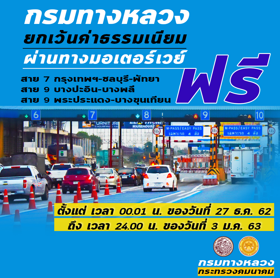 - มาตรการด้านอำนวยความสะดวกในการเดินทาง โดยกรมทางหลวงได้จัดตั้งจุดให้บริการทั่วไทย 371 แห่ง แบ่งเป็นจุดพักรถสาธารณะ 18 แห่ง (17 จังหวัด) จุดให้บริการทั่วไทย 152 แห่ง จุดให้บริการตำรวจทางหลวง 201 แห่ง และศูนย์ประสานงาน 125 ศูนย์ มีบริการห้องน้ำในพื้นที่หมวดทางหลวง และ ห้องน้ำจุดให้บริการทั่วไทย รวม 735 แห่งโดยได้บูรณาการร่วมกับตำรวจทางหลวงและหน่วยงานในพื้นที่ ได้สั่งการให้สำนักงานทางหลวง แขวงทางหลวง และหมวดทางหลวงในพื้นที่ทั่วประเทศพร้อมให้บริการประชาชนผู้ใช้ทางตลอด 24 ชั่วโมง เตรียมอุปกรณ์ และเจ้าหน้าที่ในการเปิดช่องทางพิเศษ เตรียมรถบริการซ่อมเคลื่อนที่การให้บริการและให้ความช่วยเหลือกรณีรถเสีย อีกทั้ง ยังได้มีรายงานสภาพจริงการจราจร Online แบบ Real time ผ่านแอพพลิเคชั่น M-Traffic / Thailand Highway Traffic และ QR code http://www.doh.go.th รวมถึงเปิดใช้มอเตอร์เวย์ฟรีบนหลวงพิเศษ หมายเลข 7 ทางหลวงสายกรุงเทพมหานคร - บ้านฉาง ตอนกรุงเทพมหานคร - เมืองพัทยา รวมทางแยกไปบรรจบทางสายกรุงเทพ – ชลบุรี – พัทยา และทางหลวงพิเศษหมายเลข 9 ทางหลวงแผ่นดินหมายเลข 34 (บางวัว) ทางแยกเข้าชลบุรี ทางแยกเข้าท่าเรือแหลมฉบังและทางแยกเข้าพัทยา และทางหลวงพิเศษ หมายเลข 9 ได้แก่ เส้นทางวงแหวนรอบนอกกรุงเทพมหานคร (ถนนกาญจนาภิเษก) ตอนบางปะอิน - บางพลี และตอนพระประแดง - บางแค ช่วงพระประแดง – ต่างระดับบางขุนเทียน ตั้งแต่เวลา 00.01 น. ของวันที่ 27 ธันวาคม 2562 ถึง เวลา 24.00 น. ของวันที่ 3 มกราคม 2563