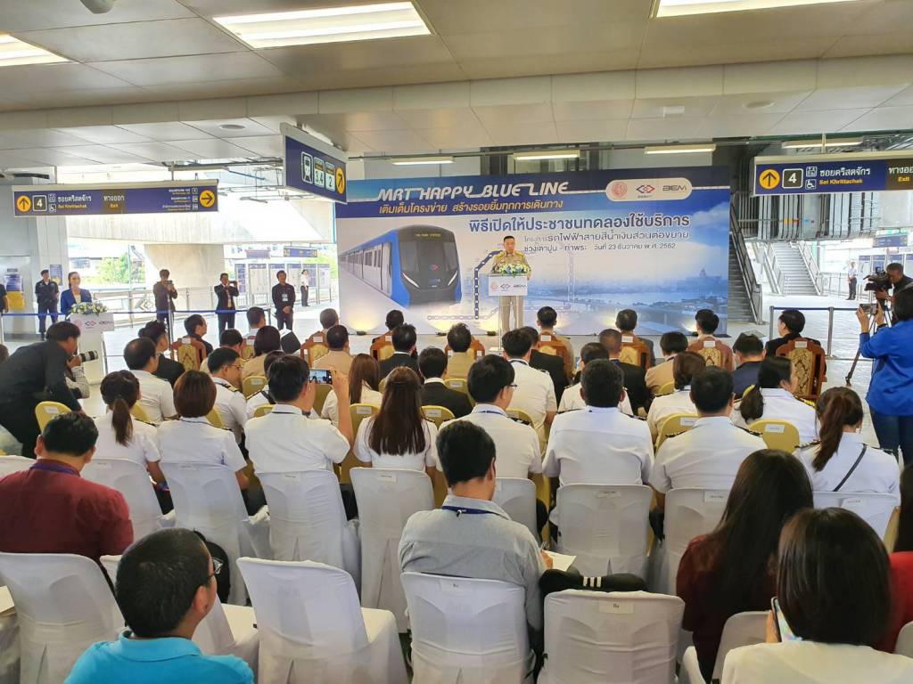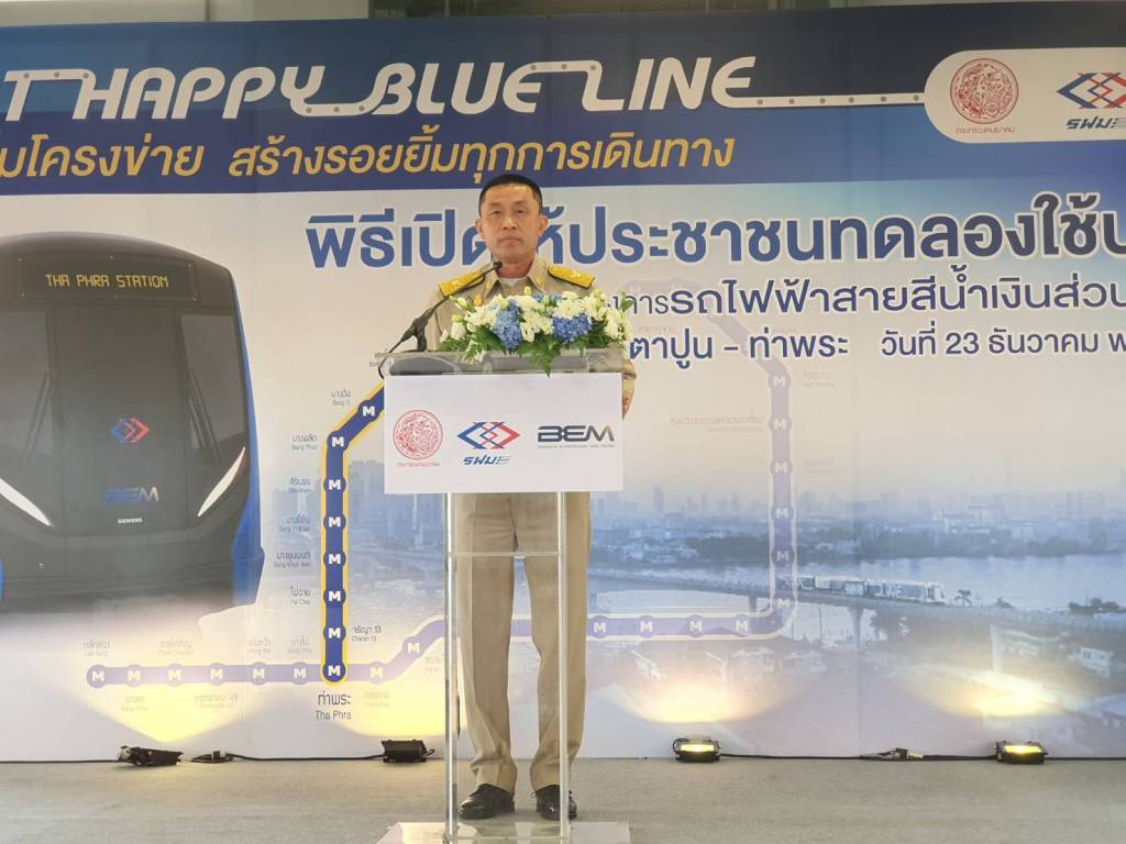 23 ธันวาคม 2562 เวลา 17:11วิ่งฉิว สายสีน้ำเงินส่วนต่อขยายฯ8 สถานีประชาชนเฮ วิ่งฉิว รฟม.-บีอีเอ็ม เปิดให้บริการรถไฟฟ้าสายสีน้ำเงินส่วนต่อขยาย ช่วงเตาปูน – ท่าพระ ทำให้รถไฟฟ้าสายนี้ครบลูป มั่นใจผู้โดยสารทะลุ 8 แสนคน/วัน “ศักดิ์สยาม” เปิดนั่งฟรี 8 สถานี มอบเป็นของขวัญปีใหม่ให้ประชาชน นายศักดิ์สยาม ชิดชอบ รมว.คมนาคม เปิดเผยภายหลังเป็นประธานในพิธีเปิดให้ประชาชนทดลองใช้บริการโครงการรถไฟฟ้าสายสีน้ำเงินส่วนต่อขยายช่วงเตาปูน – ท่าพระ จากสถานีบางโพ – สถานีสิรินธร จำนวน 4 สถานี โดยไม่คิดค่าโดยสาร ตั้งแต่วันที่ 4 ธันวาคม 2562 และได้เร่งรัดดำเนินงานในการขยายการให้บริการรถไฟฟ้าสายสีน้ำเงินส่วนต่อขยายให้ครบทุกสถานีเต็มโครงข่ายของเส้นทาง เพื่ออำนวยความสะดวกด้านการเดินทางให้กับประชาชน โดยในวันที่ 30 มี.ค.63 จะมีการเปิดใช้จริง และเก็บค่าโดยสาร และจะเชิญ พล.อ.ประยุทธ์ จันทร์โอชา นายกรัฐมนตรี มาเป็นประธาน อย่างไรก็ตาม ขณะนี้พร้อมเปิดให้ประชาชนทดลองใช้เพิ่มอีก 4 สถานี ได้แก่ สถานีบางยี่ขัน สถานีบางขุนนนท์ สถานีไฟฉาย และสถานีจรัญฯ 13 รวมเป็น 8 สถานี คือ จากสถานีบางโพ – สถานีจรัญฯ 13 ในวันที่ 23 ธันวาคม 2562 – 29 มีนาคม 2563 ตั้งแต่เวลา 10.00 – 16.00 น. เฉพาะในวันที่ 23 ธ.ค.62 จะเปิดทดลองให้บริการจากสถานีเตาปูน – สถานีสิรินธร ตั้งแต่เวลา 10.00 น. และจากสถานีเตาปูน – สถานีท่าพระ ตั้งแต่เวลา 14.30 – 18.00 น. โดยจะให้บริการรถไฟฟ้าแบบวิ่งไป-กลับ จากสถานีเตาปูน – สถานีท่าพระ มีรถไฟฟ้าให้บริการ 6 ขบวน ระยะห่างระหว่างขบวนประมาณ 8 นาที ซึ่งผู้โดยสารจากสายสีน้ำเงินปัจจุบันหรือสายสีม่วงที่ต้องการเดินทางไปปลายทางระหว่างสถานีจรัญฯ 13 – สถานีบางโพ จะต้องเปลี่ยนขบวนรถที่สถานีท่าพระหรือสถานีเตาปูน “ปัจจุบันปัญหาการจราจรติดขัดในกรุงเทพฯ เป็นปัญหาที่เกิดขึ้นมานาน และยิ่งทวีความรุนแรงมากขึ้นเรื่อยๆ ซึ่งการมีรถไฟฟ้านับเป็นทางเลือกในการอำนวยความสะดวกให้แก่ประชาชน อย่างไรก็ตามรถไฟฟ้าสายสีน้ำเงินถือเป็นหัวใจหลักของระบบรถไฟฟ้าในเขตกรุงเทพฯ เพราะรถไฟฟ้าจะวิ่งเป็นวงกลมที่อยู่ตรงกลางเชื่อมต่อกับรถไฟฟ้าสายอื่นๆ ซึ่งการเปิดให้ทดลองใช้บริการฟรีครั้งนี้ ถือเป็นของขวัญปีใหม่ให้ประชาชน”นายศักดิ์สยาม กล่าว นายศักดิ์สยาม กล่าวว่า รฟม. และบีอีเอ็มเตรียมพร้อมที่จะเปิดให้บริการรถไฟฟ้าสายสีน้ำเงินอย่างเป็นทางการเต็มรูปแบบครบ ทั้งโครงข่ายและจัดเก็บค่าโดยสารตามปกติทั้งเส้นทางวันที่ 30 มี.ค.63 เป็นต้นไป โดยจะคิดอัตราค่าโดยสารรถไฟฟ้าสายสีน้ำเงินตามระยะทาง ตั้งแต่สถานีแรก 16 บาท สูง