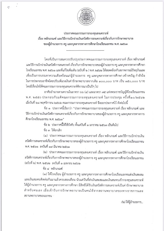 25 ธันวาคม 2562 เวลา 19:31"กนกวรรณ" รมช.ศธ. ประกาศแล้วหลักเกณฑ์ และวิธีเบิกจ่ายสวัสดิการรักษาพยาบาลแสนห้า เริ่ม 1 ม.ค. 63วันที่ 25 ธันวาคม 2562 ที่กระทรวงศึกษาธิการ ดร.กนกวรรณ วิลาวัลย์ รัฐมนตรีช่วยว่าการกระทรวงศึกษาธิการ กล่าวว่า คณะกรรมการกองทุนสงเคราะห์ ได้ออกประกาศคณะกรรมการกองทุนสงเคราะห์ เรื่อง หลักเกณฑ์ และวิธีการเบิกจ่ายสวัสดิการสงเคราะห์เกี่ยวกับการรักษาพยาบาลของผู้อำนวยการ ครู และบุคลากรทางการศึกษาโรงเรียนเอกชน พ.ศ. 2563 ซึ่งเป็นนโยบายที่รับปากกับครูโรงเรียนเอกชนเอาไว้ ในเรื่องของค่ารักษาพยาบาลครูเอกชนที่มีเพดานอยู่เพียงแค่ 100,000 บาท ต่อคนต่อปี ส่งผลให้ผู้ที่เจ็บป่วยด้วยโรคเรื้อรัง เช่น โรคมะเร็ง โรคไต โรคหัวใจ เป็นต้น ได้รับความเดือดร้อน เพราะวงเงินค่ารักษาพยาบาลที่มีอยู่ไม่เพียงพอ ทำให้ครูโรงเรียนเอกชนบางส่วนต้องลาออกเพื่อไปใช้สิทธิประกันสุขภาพถ้วนหน้า (บัตรทอง) ของสำนักงานหลักประกันสุขภาพถ้วนหน้า โดยได้เพิ่มเพดานค่ารักษาพยาบาล เพิ่มเป็น 150,000 บาทต่อคนต่อปี และขอมอบให้เป็นของขวัญให้กับชาวการศึกษาเอกชนในปีใหม่นี้ด้วย แชร์บทความนี้: