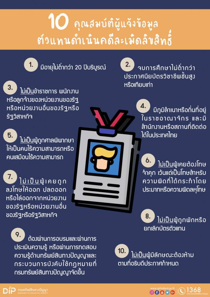 26 ธันวาคม 2562 เวลา 13:12พาณิชย์จัดระเบียบตัวแทนดำเนินคดีลิขสิทธิ์ ดีเดย์ 26 ธ.ค. 62 สแกนคิวอาร์โค้ดบัตรตัวแทนเช็คข้อมูลได้ทันทีกระทรวงพาณิชย์ โดยกรมทรัพย์สินทางปัญญาเดินหน้าแก้ไขประกาศแจ้งข้อมูลตัวแทนดำเนินคดีละเมิดลิขสิทธิ์ นำคิวอาร์โค๊ด (QR Code) ตรวจสอบตัวแทนดำเนินคดีละเมิดลิขสิทธิ์ คาดช่วยอำนวยความยุติธรรมให้ผู้เกี่ยวข้องทุกฝ่ายทั้งพนักงานสอบสวน ผู้ประกอบการและประชาชนทั่วไป และช่วยปิดช่องโหว่ปัญหาการแอบอ้างและหาประโยชน์อันมิควรได้จากการจับกุมดำเนินคดี เริ่มเปิดระบบทำบัตรตัวแทนดำเนินคดีละเมิดลิขสิทธิ์ 26 ธันวาคมนี้ เมื่อวันที่ 26 ธันวาคม 2562 นายวีรศักดิ์ หวังศุภกิจโกศล รัฐมนตรีช่วยว่าการกระทรวงพาณิชย์ เปิดเผยว่ากรมทรัพย์สินทางปัญญาได้ออกประกาศ เรื่อง การแจ้งข้อมูลตัวแทนดำเนินคดีละเมิดลิขสิทธิ์ พ.ศ.2562 เพื่ออำนวยความสะดวกในการตรวจสอบข้อมูลตัวแทนดำเนินคดีละเมิดลิขสิทธิ์แก่เจ้าหน้าที่ตำรวจ ผู้ประกอบการ และประชาชนทั่วไป โดยได้นำเทคโนโลยีคิวอาร์โค้ด (QR Code) มาประยุกต์ใช้กับบัตรตัวแทนเพื่อให้สามารถตรวจสอบข้อมูลการมอบอำนาจดำเนินคดีละเมิดลิขสิทธิ์ของตัวแทน เช่น ข้อมูลเจ้าของลิขสิทธิ์ ระยะเวลาที่ได้รับมอบอำนาจ และผลงานที่ได้รับมอบอำนาจให้ดำเนินคดี ได้ง่าย เพียงใช้สมาร์ทโฟนสแกนที่คิวอาร์โค้ด (QR Code) บนบัตรตัวแทน ก็จะทราบข้อมูลได้อย่างสะดวกและรวดเร็ว นายวีรศักดิ์ กล่าวเพิ่มเติมว่า สำหรับตัวแทนดำเนินคดีละเมิดลิขสิทธิ์ที่มีความประสงค์จะแจ้งข้อมูลตัวแทนดำเนินคดีละเมิดลิขสิทธิ์ต้องมีคุณสมบัติตามประกาศกรมทรัพย์สินทางปัญญา เช่น อายุไม่ต่ำกว่า 20 ปีบริบูรณ์ จบการศึกษาไม่ต่ำกว่า ปวส. หรือเทียบเท่า ผ่านการตรวจสอบประวัติอาชญากรรมจากสำนักงานตำรวจแห่งชาติ รวมทั้งต้องผ่านการอบรมหรือทดสอบความรู้เกี่ยวกับกฎหมายลิขสิทธิ์และจริยธรรมเบื้องต้น เพื่อคัดกรองบุคคลที่จะมาขอรับบัตรตัวแทนดำเนินคดีละเมิดลิขสิทธิ์ นายวีรศักดิ์ กล่าวทิ้งท้ายว่า ในการปฏิบัติงานของตัวแทนนั้นขอให้ดำเนินการตามที่กฎหมายได้ให้อำนาจไว้และดำเนินการอย่างสุภาพ แต่งกายเรียบร้อย ไม่ดำเนินการขัดต่อกฎหมายหรือสิทธิเสรีภาพของบุคคลอื่น มิฉะนั้นอาจเข้าข่ายขาดคุณสมบัติการเป็นตัวแทนดำเนินคดีละเมิดลิขสิทธิ์ จึงอยากขอความร่วมมือเจ้าของลิขสิทธิ์และตัวแทนเจ้าของลิขสิทธิ์ที่จะแต่งตั้งตัวแทนดำเนินคดีละเมิดลิขสิทธิ์ มาแจ้งข้อมูลตัวแทนดำเนินคดีละเมิดลิขสิทธิ์กับกรมทรัพย์สินทางปัญญา เพื่อยกระดับบังคับใช้กฎหมายลิขสิทธิ์ให้