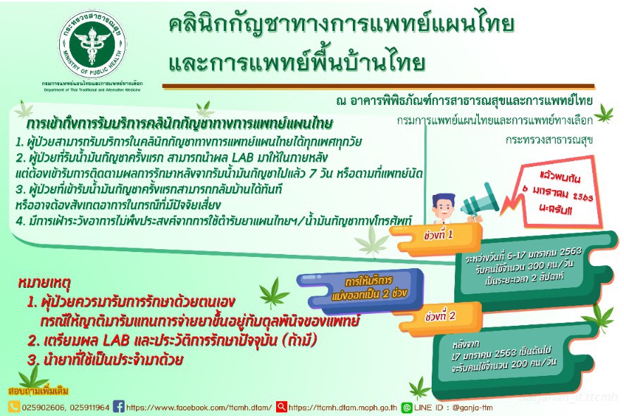 นายอนุทิน ชาญวีรกูล รองนายกรัฐมนตรีและรัฐมนตรีว่าการกระทรวงสาธารณสุข ให้สัมภาษณ์ว่า ตั้งแต่วันที่ 6 มกราคม 2563 กระทรวงสาธารณสุข จะเปิดคลินิกกัญชาทางการแพทย์แผนไทย ที่อาคารพิพิธภัณฑ์การสาธารณสุขและการแพทย์แผนไทย (อาคารเรือนไทย) กรมการแพทย์แผนไทยและการแพทย์ทางเลือก ทุกวัน ยกเว้นวันหยุดนักขัตฤกษ์ จากเดิมที่เปิดบริการเฉพาะวันอังคาร เพื่อให้ผู้ป่วยในเขตรอบกทม. เข้าถึงบริการเพิ่มมากขึ้น โดยมีระบบการจองคิวล่วงหน้า ผ่านแอปพลิเคชัน “กัญชาทางการแพทย์แผนไทย” “Dr.Ganja in TTM” ทางสมาร์ทโฟนระบบแอนดรอยด์ เพิ่มความสะดวกในการรับบริการให้รวดเร็วขึ้น หรือเดินทางมารับบริการด้วยตนเอง จะมีการซักประวัติ และมีแพทย์แผนไทยเป็นผู้สั่งจ่ายยาและให้คำปรึกษาอย่างใกล้ชิด ซึ่งผู้ป่วยควรมารับยาด้วยตนเอง การให้ญาติมารับยาแทนจะอยู่ในดุลยพินิจของแพทย์ และควรนำยาที่ใช้ประจำติดตัวมาด้วยในวันที่มารับบริการ สอบถามข้อมูลเพิ่มเติม โทร 025902606, 025911964
