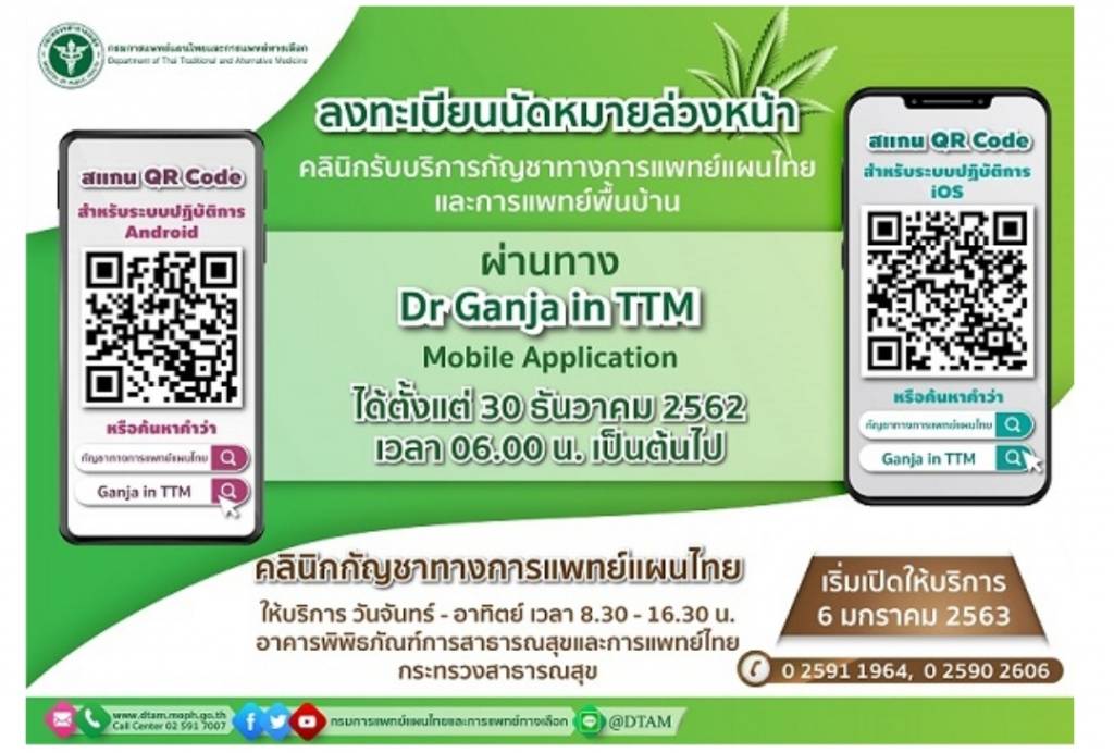 รองนายกรัฐมนตรีและรัฐมนตรีว่าการกระทรวงสาธารณสุข เพิ่มการเข้าถึงกัญชาทางการแพทย์ในเขตเมือง เปิดคลินิกกัญชาทางการแพทย์แผนไทยที่อาคารเรือนไทย เริ่ม 6 มกราคม 2563 จองคิวล่วงหน้าผ่านแอปพลิเคชัน “กัญชาทางการแพทย์แผนไทย” “Dr.Ganja in TTM” ทางสมาร์ทโฟนระบบแอนดรอยด์ ข้อมูลล่าสุด ยอดจองนัดคิวรับบริการคลินิกทางการแพทย์แผนไทย 919 คิว