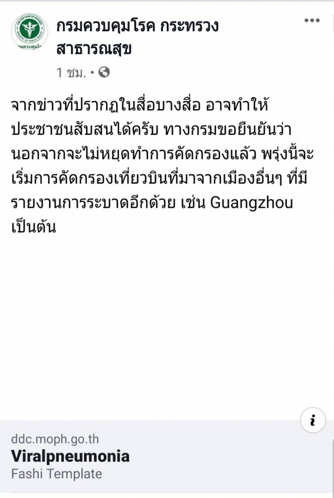 "จากข่าวที่ปรากฏในสื่อบางสื่อ อาจทำให้ประชาชนสับสนได้ ทางกรมขอยืนยันว่า นอกจากจะไม่หยุดทำการคัดกรองแล้ว พรุ่งนี้จะเริ่มการคัดกรองเที่ยวบินที่มาจากเมืองอื่นๆ ที่มีรายงานการระบาดอีกด้วย เช่น Guangzhou เป็นต้น"