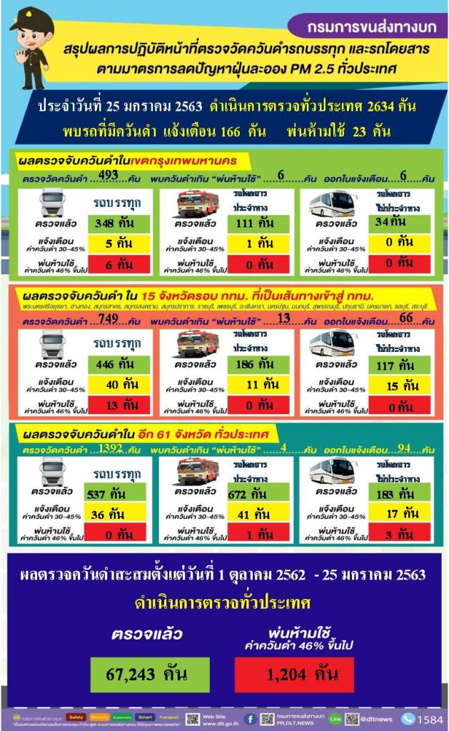 4.รวมผลการดำเนินการตรวจวัดควันดำรถโดยสารและรถบรรทุกทั่วประเทศวันที่ 25 มกราคม 2563 จำนวน 2,634 คัน พบค่าควันดำเกิน จำนวน 23 คัน โดยรถที่มีค่าควันดำเกินกว่าที่กฎหมายกำหนดได้พ่นห้ามใช้ทุกคัน และรถที่มีค่าควันดำ 30 - 44 % ได้ออกใบเตือน จำนวน 166 คัน เพื่อให้ผู้ประกอบการไปบำรุงดูแลรักษารถไม่ให้มีค่าควันดำเกิน