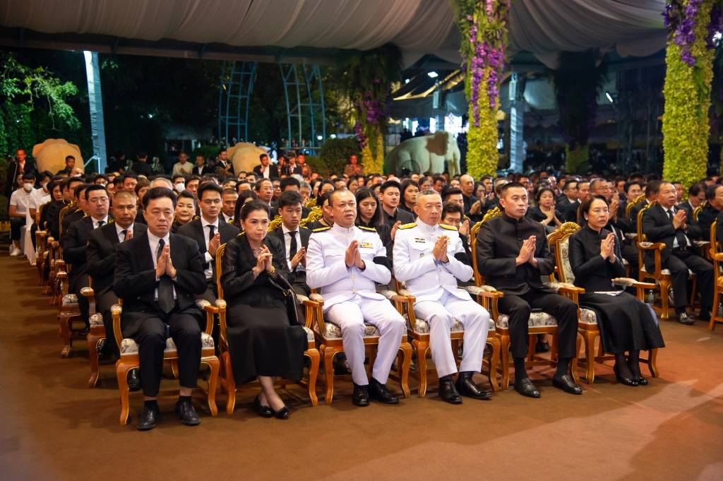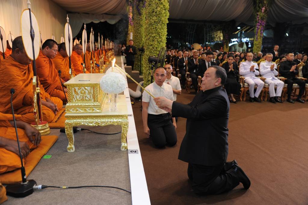 โดยพิธีสวดพระอภิธรรม มี นายจุติ ไกรฤกษ์ รัฐมนตรีว่าการกระทรวงการพัฒนาสังคมและความมั่นคงของมนุษย์ เป็นประธานจุดธูปบูชาพระรัตนตรัย และจุดธูปเทียนบูชาพระธรรม ซึ่งภายในงานมีผู้ดำรงตำแหน่งทางการเมือง และข้าราชการระดับสูงเข้าร่วมเป็นจำนวนมาก อาทิ นายสุวัจน์ ลิปตพัลลภ อดีตรองนายกรัฐมนตรี, นายกรณ์ จาติกวณิช อดีตรัฐมนตรีว่าการกระทรวงการคลัง, นายเทวัญ ลิปตพัลลภ รัฐมนตรีประจำสำนักนายกรัฐมนตรี, นายนิคม ไวยรัชพานิช อดีตประธานวุฒิสภา, นายประเสริฐ บุญชัยสุข ที่ปรึกษารัฐมนตรีประจำสำนักนายกรัฐมนตรี, นพ.วรรณรัตน์ ชาญนุกูล ที่ปรึกษารัฐมนตรีประจำสำนักนายกรัฐมนตรี, นพ. หม่อมหลวง สมชาย จักรพันธ์ ประธานคณะที่ปรึกษารัฐมนตรีว่าการกระทรวงสาธารณสุข, พล.ต.อ. ศรีวรา รังสิพราหมณกุล ที่ปรึกษานายกรัฐมนตรี, พลเอก สนธยา ศรีเจริญ สมาชิกวุฒิสภา, นายประสงค์ พูนธเนศ ปลัดกระทรวงการคลัง, นายสราวุธ เบญจกุล เลขาธิการสำนักงานศาลยุติธรรม, นายปวิณ ชำนิประศาสน์ รองปลัดกระทรวงมหาดไทย, นายจิรุตม์ วิศาลจิตร อธิบดีกรมการขนส่งทางบก, นายดำรงชัย เนรมิตตกพงศ์ รองผู้ว่าราชการจังหวัดบุรีรัมย์