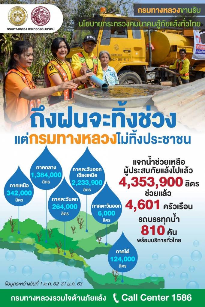 กรมทางหลวงขานรับนโยบายของนายศักดิ์สยาม ชิดชอบ รัฐมนตรีว่าการกระทรวงคมนาคม ในการแก้ปัญหาภัยแล้ง พร้อมเดินหน้าคลายความเดือดร้อนชาวบ้าน และหน่วยงานต่างๆ ช่วงภัยแล้ง ระดมรถบรรทุกน้ำ 810 คัน แจกน้ำดื่มน้ำใช้กว่า 4 ล้านลิตร 4,601 ครัวเรือนทั่วประเทศ ช่วยดับไฟป่า 225 ครั้ง แนะขาดน้ำโทรสายด่วนกรมทางหลวง 1586 ตลอด 24 ชั่วโมง ออกนโยบายหน่วยงานสังกัดจ้างเกษตรกรทำงานในโครงการที่มีอยู่ชดเชยรายได้สูญ พร้อมแผนช่วยรายได้ชาวสวนยางสั่งเพิ่มปริมาณใช้น้ำยางดิบปีนี้ 26,564 ตัน