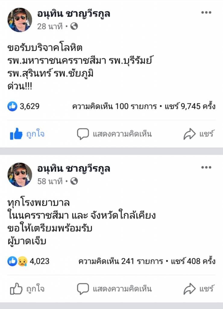 ผู้สื่อข่าวรายงานว่า เมื่อเวลา 20:55 น. นายอนุทิน ชาญวีรกูล รองนายกรัฐมนตรี และรัฐมนตรีว่าการกระทรวงสาธารณสุข พร้อม นายแพทย์สุขุม กาญจนพิมาย ปลัดกระทรวงสาธารณสุข ได้เดินทางลงพื้นที่จังหวัดนครราชสีมา เพื่อติดตามสถานการณ์ โดยเบื้องต้นจะไปยังโรงพยาบาลมหาราช เพื่อระดมทีมแพทย์ และเจ้าหน้าที่ ทั้งในและจังหวัดใกล้เคียง รวมถึงการเตรียมเลือด รองรับในกรณีที่มีผู้บาดเจ็บจำนวนมาก