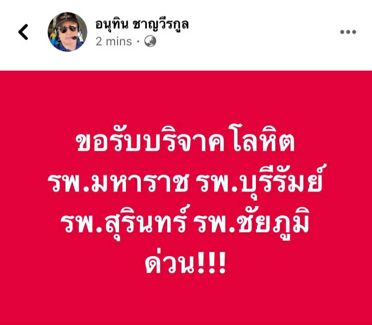 ขณะที่ Facebook อนุทิน ชาญวีรกูล ปรากฏข้อความระบุว่า