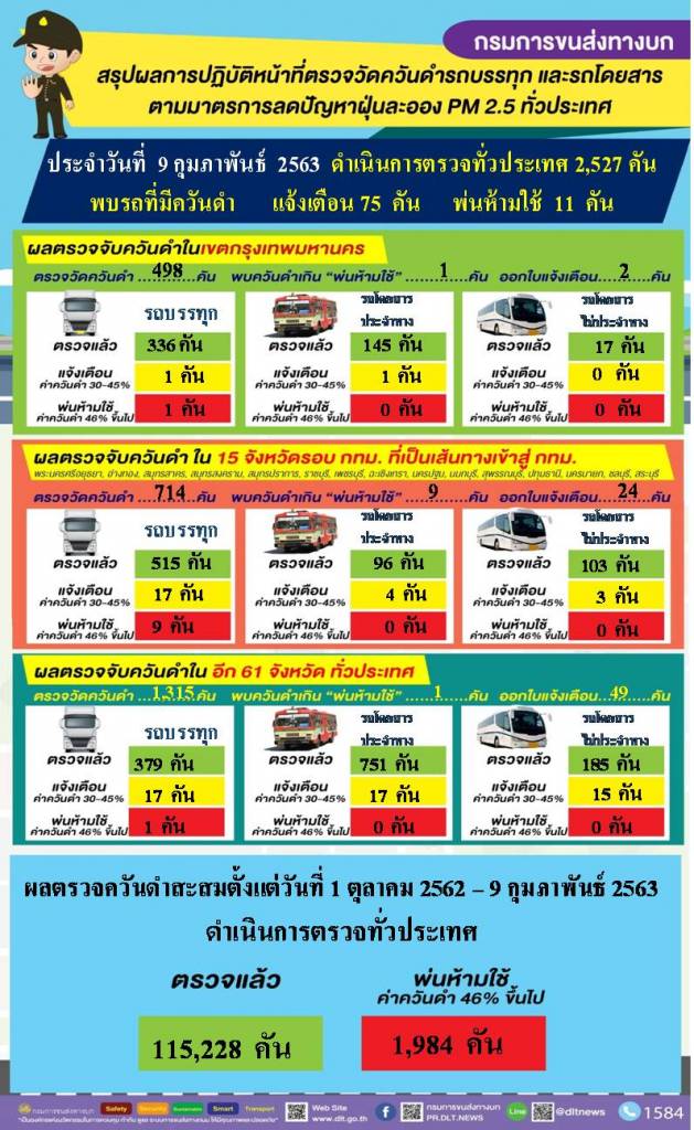 เฉพาะวันที่ 9 กุมภาพันธ์ 2563 ดำเนินการตรวจวัดควันดำรถโดยสารและรถบรรทุกทั่วประเทศ จำนวน 2,527 คัน พบค่าควันดำเกิน จำนวน 11 คัน โดยรถที่มีค่าควันดำเกินกว่าที่กฎหมายกำหนดได้พ่นห้ามใช้ทุกคัน และพบรถที่มีค่าควันดำ 30 - 45 % ได้ออกใบเตือน จำนวน 75 คัน เพื่อให้ผู้ประกอบการไปบำรุงดูแลรักษารถไม่ให้มีค่าควันดำเกิน แบ่งเป็น ดังนี้