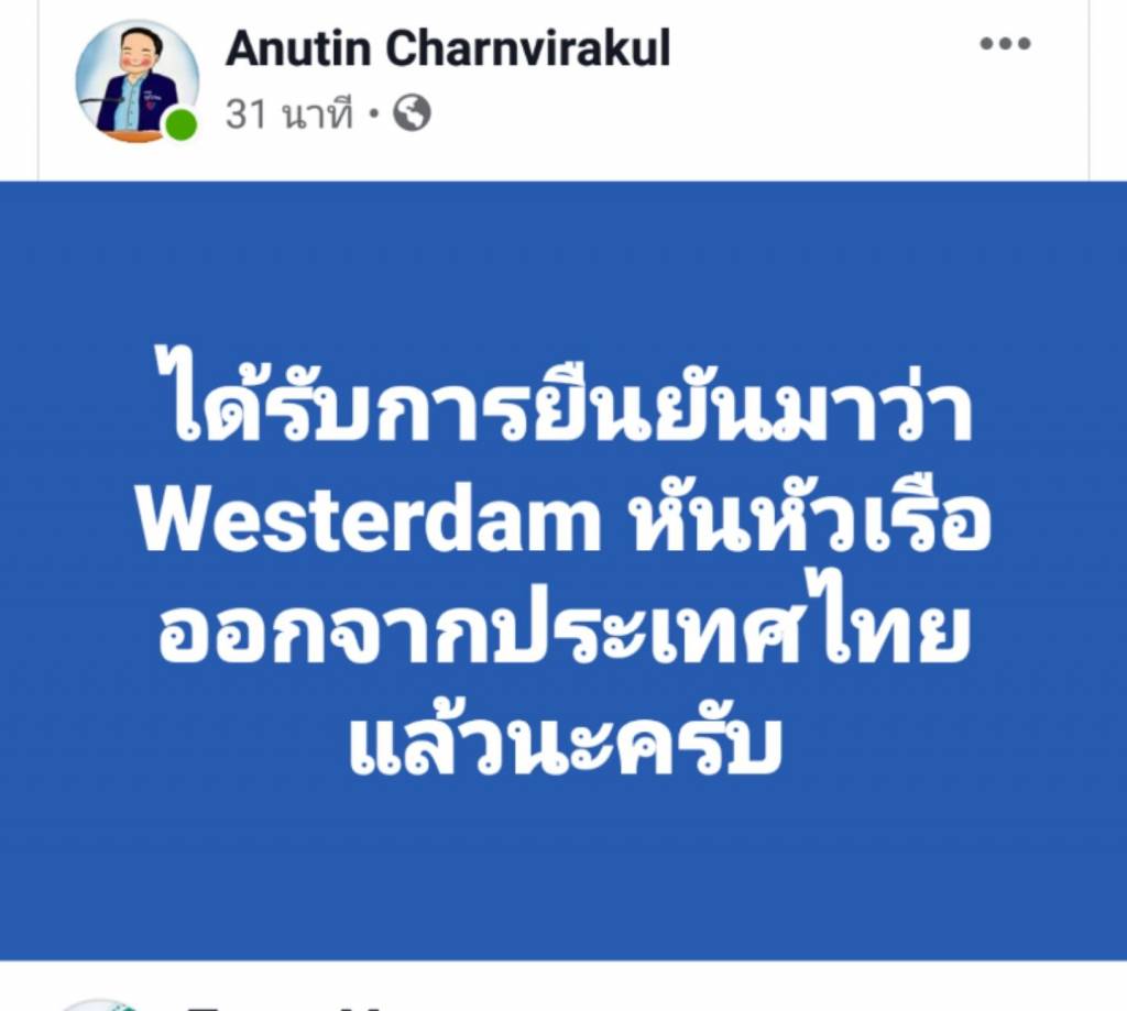 "ได้รับการยืนยันมาว่า Westerdam หันหัวเรือออกจากประเทศไทยแล้วนะครับ"