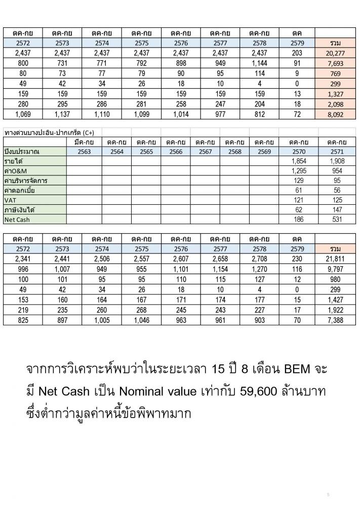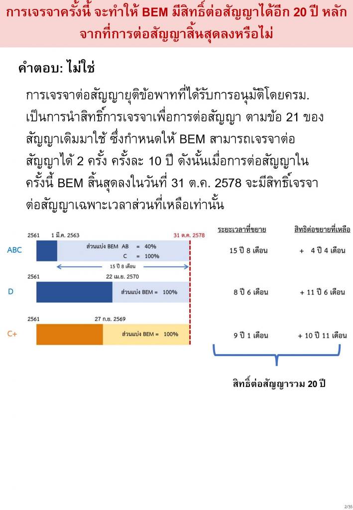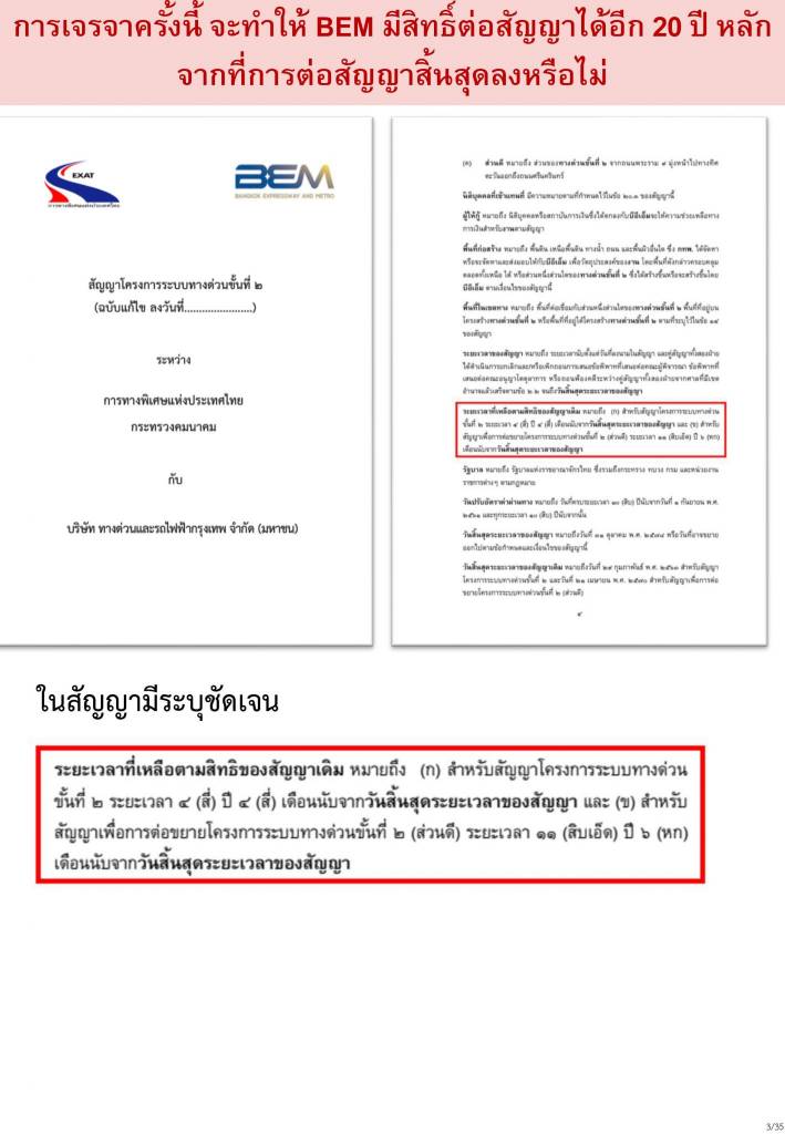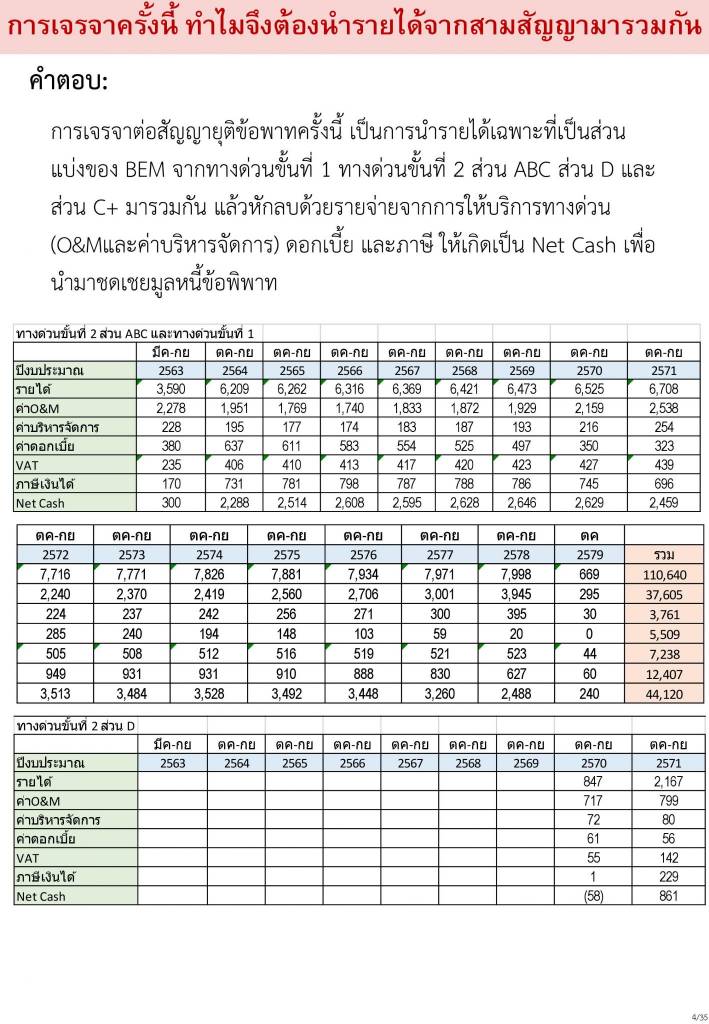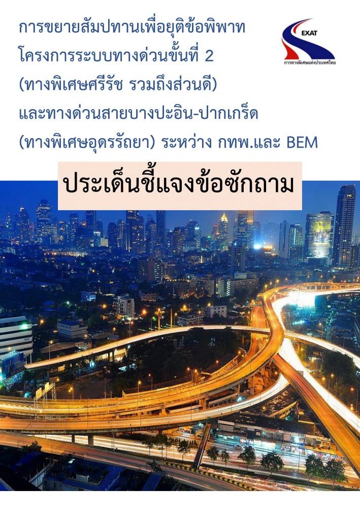 รายงานจากการทางพิเศษแห่งประเทศไทย (กทพ.) ระบุว่า ตามที่วานนี้ (18 ก.พ. 2563) ที่ประชุมคณะรัฐมนตรี (ครม.) มีมติเห็นชอบแนวทางยุติข้อพิพาททางด่วนระหว่าง กทพ. กับบริษัท ทางด่วนและรถไฟฟ้ากรุงเทพ จำกัด (มหาชน) หรือ BEM ตามที่กระทรวงคมนาคมเสนอ โดยจะถอนฟ้องทั้ง 17 คดี แลกกับการขยายสัญญาสัมปทานทางด่วน 3 ฉบับ ระยะเวลา 15 ปี 8 เดือน หรือไปสิ้นสุดสัญญาพร้อมกันในวันที่ 31 ต.ค. 2578 พร้อมทั้ง BEM จะต้องยกเว้นค่าผ่านทางในวันหยุดนักขัตฤกษ์ ตามที่สำนักนายกรัฐมนตรีประกาศเป็นวันหยุดด้วย รวมถึงมีเงื่อนไขว่า กทพ.สามารถสร้างทางแข่งขันได้ โดยไม่ถูก BEM ฟ้องร้องได้อีกในอนาคตนั้น ล่าสุด กทพ. ขอชี้แจง กรณีในข้อสงสัยเรื่องการขยายสัญญาสัมปทานโครงการระบบทางด่วนขั้นที่ 2 (ทางพิเศษศรีรัช รวมถึงส่วนดี) และทางด่วนสายบางปะอิน-ปากเกร็ด (ทางพิเศษอุดรรัถยา) โดยเฉพาะในประเด็นที่ว่า การเจรจาครั้งนี้จะทำให้ BEM มีสิทธ์ิต่อสัญญาได้อีก 20 ปี หลังจากที่การต่อสัญญาสิ้นสุดลงหรือไม่นั้น กทพ.ยืนยันว่า BEM จะไม่มีสิทธ์ิต่อสัญญาได้อีก 20 ปี หลังจากที่การต่อสัญญาสิ้นสุดลง เนื่องจากการเจรจาต่อสัญญายุติข้อพิพาทที่ได้รับการอนุมัติโดย ครม. เป็นการนำสิทธิ์การเจรจาเพื่อการต่อสัญญา ตามข้อ 21 ของสัญญาเดิมมาใช้ ซึ่งกำหนดให้ BEM สามารถเจรจาต่อสัญญาได้ 2 ครั้ง ครั้งละ 10 ปี ดังนั้น เมื่อการต่อสัญญาในครั้งนี้ BEM สิ้นสุดลงในวันท่ี 31 ต.ค.2578 จะมีสิทธิ์เจรจาต่อสัญญา เฉพาะเวลาส่วนที่เหลือเท่านั้น โดยในสัญญามีการระบุไว้อย่างชัดเจน ขณะเดียวกัน ในส่วนของข้อสงสัยที่ว่า การเจรจาครั้งนี้ ทำไมจึงต้องนำรายได้จาก 3 สัญญามารวมกันนั้น กทพ. ให้รายละเอียดว่า การเจรจาต่อสัญญายุติข้อพิพาทครั้งนี้ เป็นการนำรายได้เฉพาะท่ีเป็นส่วนแบ่งของ BEM จากทางด่วนขั้นท่ี 1 ทางด่วนขั้นที่ 2 ส่วน A, B, C ส่วน D และส่วน C+ มารวมกัน แล้วหักลบด้วยรายจ่ายจากการให้บริการทางด่วน (O&M และค่าบริหารจัดการ) ดอกเบี้ย และภาษี ให้เกิดเป็น Net Cash เพื่อนำมาชดเชยมูลหน้ีข้อพิพาท อย่างไรก็ตาม จากการวิเคราะห์พบว่า ในระยะเวลา 15 ปี 8 เดือน BEM จะมี Net Cash เป็น Nominal value เท่ากับ 59,600 ล้านบาท ซึ่งต่ำกว่ามูลค่าหนี้ข้อพิพาทเป็นจำนวนมาก