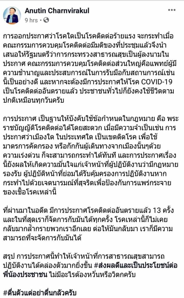 ล่าสุด นายอนุทิน ชาญวีรกูล รองนายกรัฐมนตรี และรัฐมนตรีว่าการกระทรวงสาธารณสุข โพสต์เฟซบุ๊ก "Anutin Charnvirakul" ถึงประเด็นดังกล่าวว่า การออกประกาศว่าโรคใดเป็นโรคติดต่อร้ายแรง จะกระทำเมื่อ คณะกรรมการควบคุมโรคติดต่อมีมติของที่ประชุมแล้วจึงนำเสนอให้รัฐมนตรีว่าการกระทรวงสาธารณสุขเป็นผู้ลงนามในประกาศ คณะกรรมการควบคุมโรคติดต่อส่วนใหญ่คือแพทย์ผู้มีความชำนาญและประสบการณ์ในการรับมือกับสถานการณ์เช่นนี้เป็นอย่างดี และหากจะต้องมีการประกาศให้โรค COVID-19 เป็นโรคติดต่ออันตรายแล้ว ประชาชนทั่วไปก็ยังคงใช้ชีวิตตามปกติเหมือนทุกวัน การประกาศ เป็นฐานให้บังคับใช้ข้อกำหนดในกฎหมาย คือ พระราชบัญญัติโรคติดต่อได้โดยสะดวก เมื่อมีความจำเป็นเช่น การประกาศว่าเมืองใด ในประเทศใด เป็นเขตติดโรค เพื่อใช้มาตรการคัดกรอง หรือกักกันผู้เดินทางจากเมืองนั้นๆด้วยความเร่งด่วน ก็จะสามารถกระทำได้ทันที และการประกาศเรื่องนี้ยังผลให้เกิดความมั่นใจแก่เจ้าหน้าที่ผู้ปฏิบัติงานว่ามีกฏหมายรองรับ ผู้ปฏิบัติหน้าที่ย่อมได้รับคุ้มครองการปฏิบัติงานหากกระทำไปด้วยเจตนารมณ์ที่สุจริตเพื่อป้องกันการแพร่กระจายของเชื้อโรคเหล่านี้ ที่ผ่านมาในอดีต มีการประกาศโรคติดต่ออันตรายแล้ว 13 ครั้งและในที่สุดเราก็จัดการกับมันได้ทุกครั้ง โรคเหล่านี้ก็ไม่เคยกลับมากล้ำกรายพวกเราอีกเลย ต่อให้มันกลับมา เราก็มีความสามารถที่จะจัดการกับมันได้ สรุป การประกาศนี้ทำให้เจ้าหน้าที่การสาธารณสุขสามารถปฏิบัติงานได้คล่องตัวมากยิ่งขึ้น #ส่งผลดีและเป็นประโยชน์ต่อพี่น้องประชาชน ไม่มีอะไรต้องหวั่นหรือวิตกครับ #ตื่นตัวแต่อย่าตื่นกลัวขอให้เชื่อถือเฉพาะข่าวสารและข้อมูลจากกระทรวงสาธารณสุขที่มีการแถลงต่อพี่น้องประชาชนทุกวันเป็นสำคัญ