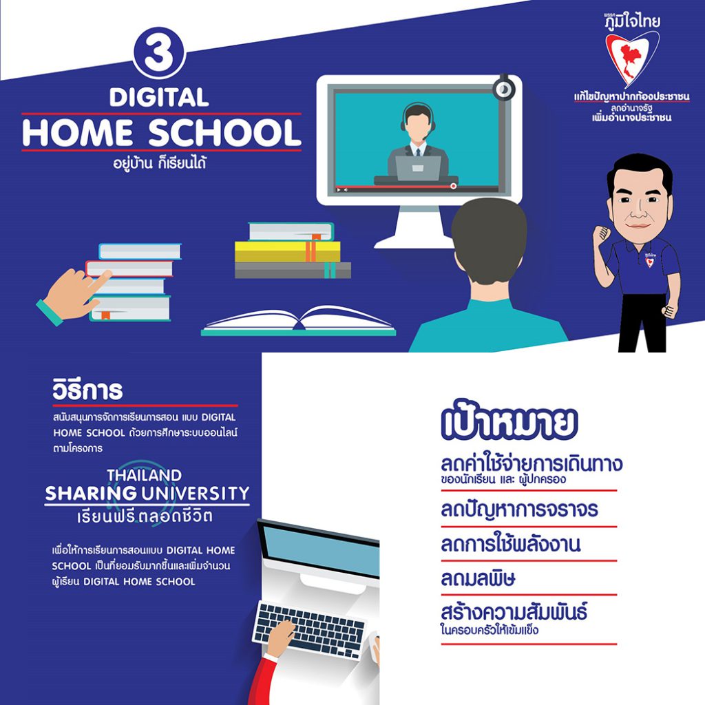 แนวคิดที่ 3 “Digital Home School อยู่บ้านก็เรียนได้” เพื่อลดค่าใช้จ่ายในการเดินทาง ลดปัญหาจราจร ลดการใช้พลังงาน ลดมลพิษ สร้างความสัมพันธ์กับครอบครัว โดยจะสนับสนุนการจัดการเรียนการสอนแบบ Digital Home School ด้วยการศึกษาผ่านออนไลน์ ตามโครงการ “Thailand Sharing University เรียนฟรี ตลอดชีวิต”