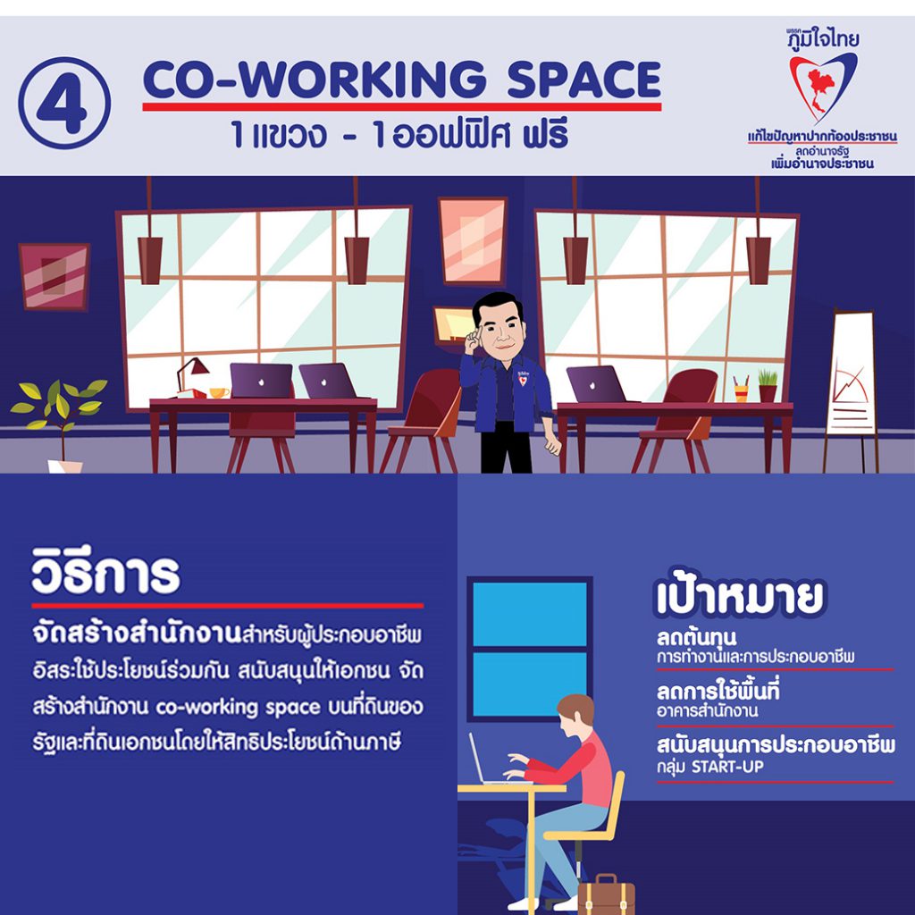 แนวคิดที่ 4 “Co-Working Space 1 แขวง 1 ออฟฟิศ” เพื่อลดต้นทุนการทำงานและการประกอบอาชีพ ลดการใช้พื้นที่อาคารสำนักงาน สนับสนุนการประกอบอาชีพให้กับกลุ่ม Start-Up ด้วยการจัดสร้างสำนักงานสำหรับผู้ประกอบอาชีพอิสระใช้ประโยชน์ร่วมกัน สนับสนุนการให้เอกชน จัดสร้างสำนักงาน Co-Working Space บนที่ดินของรัฐ และที่ดินเอกชนโดยให้สิทธิประโยชน์ด้านภาษี