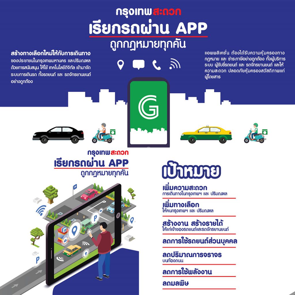 “กรุงเทพ สะดวก” นำเสนอแนวคิดที่ 1 “เรียกรถผ่าน แอพพลิเคชั่น ถูกกฎหมายทุกคัน” สร้างทางเลือกใหม่ในการเดินทาง ของประชาชนในเขตกรุงเทพมหานครและปริมณฑล ด้วยการสนับสนุนเทคโนโลยีดิจิทัล เข้ามาเพิ่มทางเลือกด้านการให้บริการประชาชนในการคมนาคม พร้อมจัดการระบบการเดินรถ ทั้งรถยนต์และรถจักรยานยนต์อย่างถูกต้อง แอพพลิเคชั่นเรียกรถ ต้องได้รับความคุ้มครองทางกฎหมาย ชำระภาษีถูกต้อง ทั้งผู้ให้บริการและผู้ใช้บริการ ให้ความสะดวกปลอดภัย คุ้มครองสวัสดิภาพให้ผู้โดยสาร เป็นการเพิ่มความสะดวก เพิ่มทางเลือก สร้างงาน สร้างรายได้ ลดการใช้รถยนต์ส่วนบุคคล ลดปริมาณการจราจร ลดการใช้พลังงานและลดมลพิษ ซี่งจะออกกฎหมายรับรองความถูกต้อง ของบริการทางเทคโนโลยี ภายใน 90 วัน