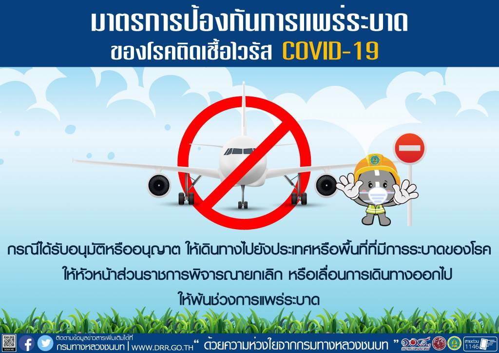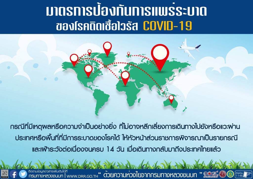 ทั้งนี้ หากได้รับอนุมัติหรืออนุญาตให้เดินทางไปยังประเทศหรือพื้นที่ที่มีการระบาดของเชื้อฯ ให้หัวหน้าส่วนราชการพิจารณายกเลิกหรือเลื่อนการเดินทางออกไปให้พ้นช่วงการแพร่ระบาด และกรณีที่มีเหตุผลหรือความจำเป็นอย่างยิ่งที่ไม่อาจหลีกเลี่ยงการเดินทางหรือแวะผ่านประเทศพื้นที่ที่มีการระบาด ให้หัวหน้าส่วนราชการพิจารณาเป็นรายกรณีและเฝ้าระวังต่อเนื่องจนครบ 14 วัน เมื่อเดินทางกลับมาถึงประเทศไทยแล้ว