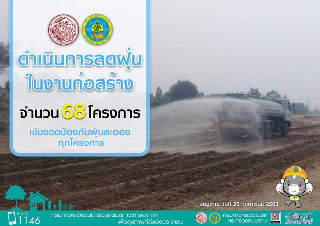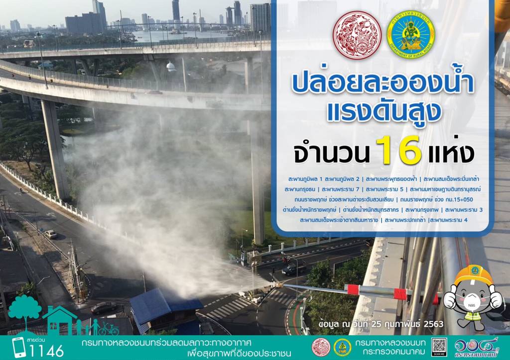 โดยได้ดำเนินการตามมาตรการแก้ไขปัญหาฝุ่นละอองขนาดเล็ก PM 2.5 ไปแล้ว ประกอบด้วยการดำเนินการลดฝุ่นในงานก่อสร้าง จำนวนโครงการทั้งหมด 68 โครงการ มีการดำเนินการเข้มงวดป้องกันฝุ่นละอองทุกโครงการ การปล่อยละอองน้ำแรงดันสูงเพื่อดักจับฝุ่นละออง จำนวน 16 แห่ง ได้แก่ สะพานภูมิพล 1 และสะพานภูมิพล 2 สะพานพระพุทธยอดฟ้า สะพานสมเด็จพระปิ่นเกล้า สะพานกรุงธน สะพานพระราม 7 สะพานพระราม 5 สะพานมหาเจษฎาบดินทรานุสรณ์