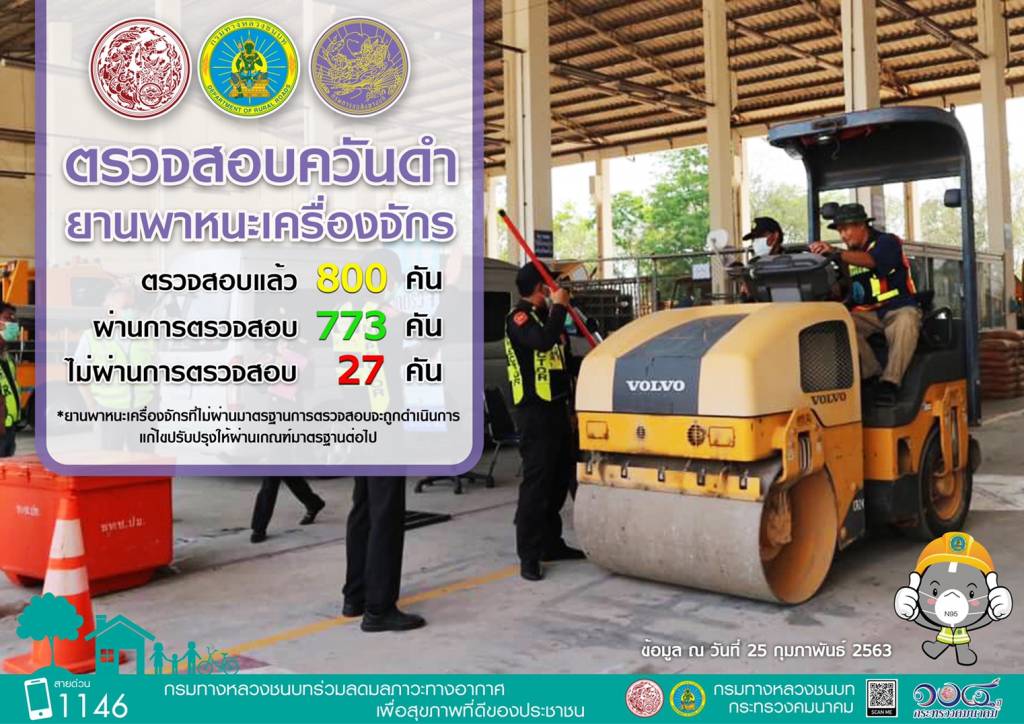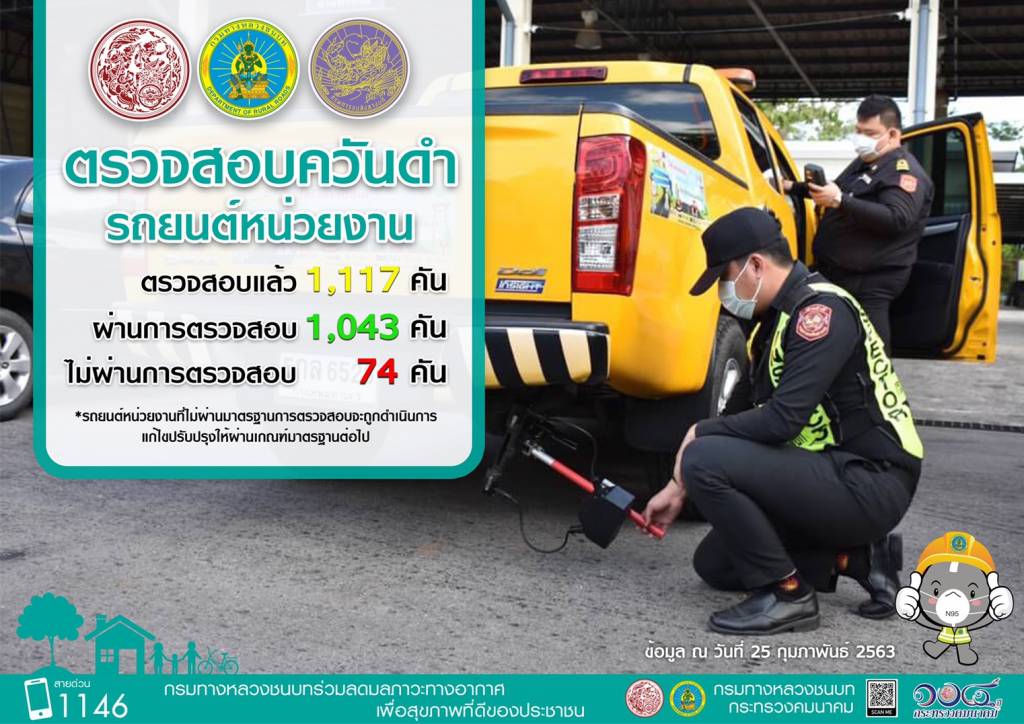แบ่งออกเป็น 2 ส่วน คือรถยนต์ของหน่วยงาน และยานพาหนะเครื่องจักรผู้รับเหมา โดยมีรถยนต์ของหน่วยงาน จำนวนทั้งหมด 5,119 คัน ได้ดำเนินการตรวจสอบควันดำแล้ว จำนวน 1,117 คัน ผ่านการตรวจสอบ 1,043 คัน และไม่ผ่าน 74 คัน รวมถึงยานพาหนะเครื่องจักรผู้รับเหมา ในจำนวน 68 โครงการก่อสร้าง ได้ตรวจสอบควันดำ จำนวน 800 คัน ผ่านการตรวจสอบ 773 คัน และไม่ผ่าน 27 คัน สำหรับคันที่ไม่ผ่านเกณฑ์จะดำเนินการแก้ไขให้เป็นไปตามเกณฑ์ต่อไป