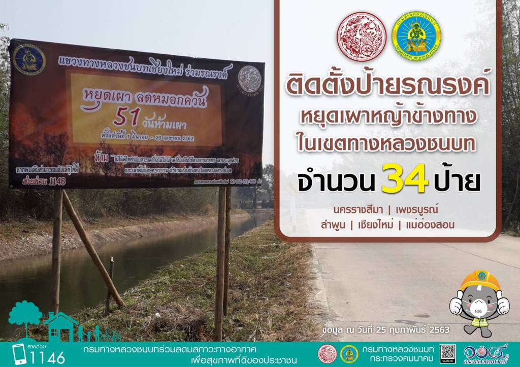 นอกจากนี้ ยังได้ติดตั้งป้ายรณรงค์ ประชาสัมพันธ์ หยุดเผาหญ้าข้างทางในเขตทางหลวงชนบท ได้แก่ จังหวัดนครราชสีมา เพชรบูรณ์ ลำพูน เชียงใหม่ และแม่ฮ่องสอน จำนวน 34 ป้าย ซึ่งหากเกิดเหตุจะสนับสนุนรถบรรทุกน้ำพร้อมบุคลากร บูรณาการดับไฟป่าร่วมกับหน่วยงานในพื้นที่อย่างเร่งด่วนอีกด้วย