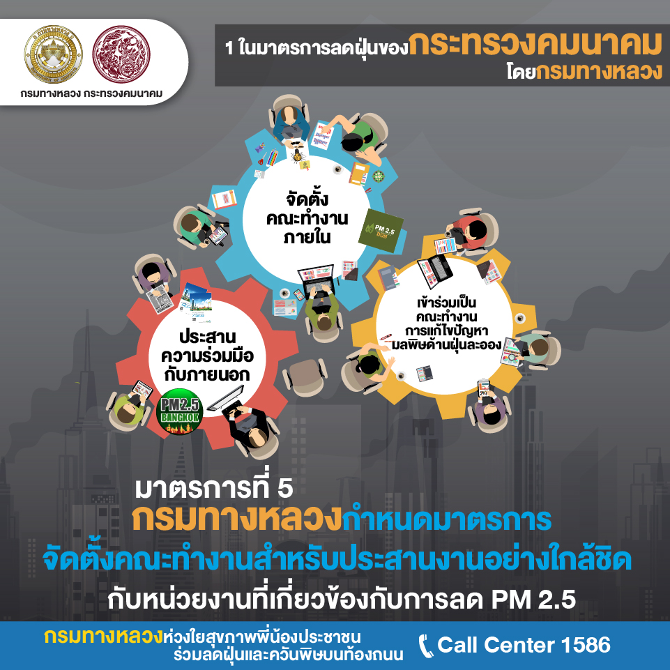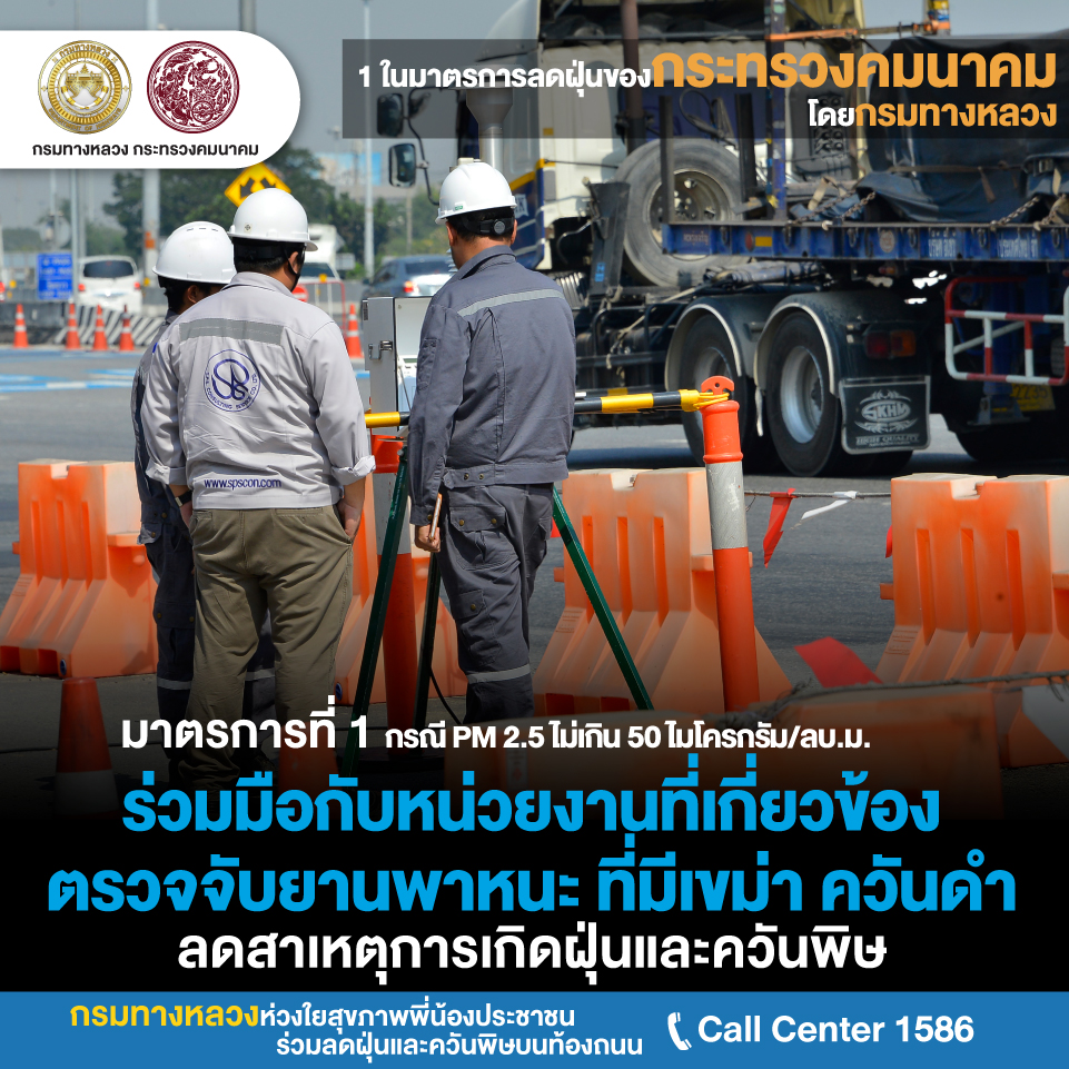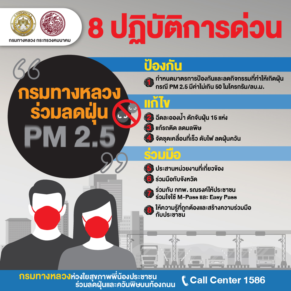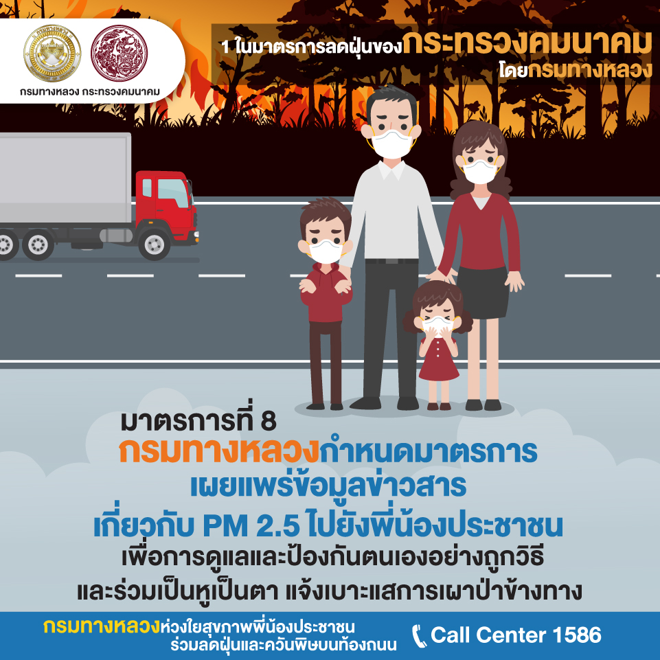 - มาตรการที่แปด การเผยแพร่ข้อมูลข่าวสารเกี่ยวกับ PM 2.5 ไปยังประชาชน เพื่อให้ความรู้เกี่ยวกับการดูแลและป้องกันตนเองอย่างถูกวิธี และร่วมเป็นส่วนหนึ่งในการช่วยดูแลปัญหาการเกิดไฟไหม้ข้างทาง โดยสามารถแจ้งเบาะแสได้ที่สายด่วนกรมทางหลวง 1586 (โทรฟรีทุกเครือข่ายตลอด 24 ชั่วโมง)