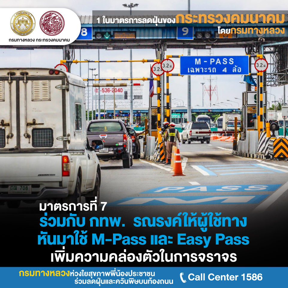 - มาตรการที่เจ็ด การร่วมมือกับการทางพิเศษแห่งประเทศไทย (กทพ.) ในการรณรงค์และกำหนดมาตรการจูงใจให้ผู้ใช้ทางหันมาใช้ M-Pass และ Easy Pass โดยได้เพิ่มจุดรับสมัครและเติมเงิน M-Pass บนทางหลวงพิเศษระหว่างเมือง (มอเตอร์เวย์) 5 จุด คือ ด่านเก็บค่าผ่านทางฯ ทับช้าง 1, ด่านเก็บค่าผ่านทางฯ ทับช้าง 2, Service Area ขาเข้า, Service Area ขาออก และด่านเก็บค่าผ่านทางฯ โป่ง 3 ตลอดจนการลดค่าธรรมเนียมผ่านทางสำหรับดอนเมืองโทลล์เวย์ ด้วยการจำหน่ายคูปองส่วนลดร้อยละ 5 ต่อเล่ม เป็นระยะเวลา 6 เดือน ตั้งแต่วันนี้ถึง 21 มิ.ย. 2563 ซึ่งคูปองสามารถใช้ได้นาน 5 ปี