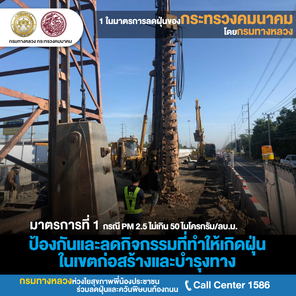 - มาตรการแรก การป้องกันและลดกิจกรรมที่ทำให้เกิดฝุ่นละอองในงานก่อสร้างและบำรุงทาง บนท้องถนน และในการปฏิบัติงานของกรมทางหลวง รวมทั้งเข้มงวดมาตรการป้องกันและลดฝุ่นละออง เช่น การปิดคลุมวัสดุก่อสร้างในการเก็บกองและขนย้าย การตรวจสอบสภาพเครื่องจักรก่อสร้างให้อยู่ในสภาพดี ห้ามใช้เครื่องจักรที่ก่อให้เกิดเขม่าควันดำ และการงดใช้น้ำมันเครื่องที่ใช้แล้วกับเครื่องจักรอุปกรณ์ เป็นต้น