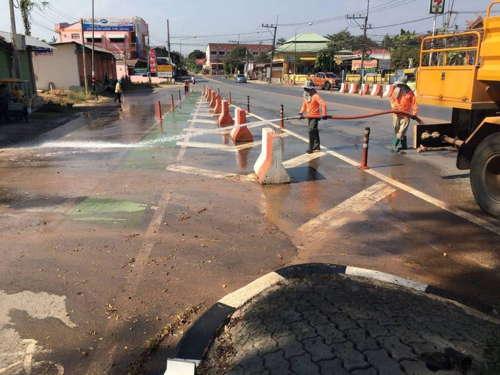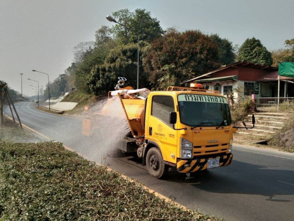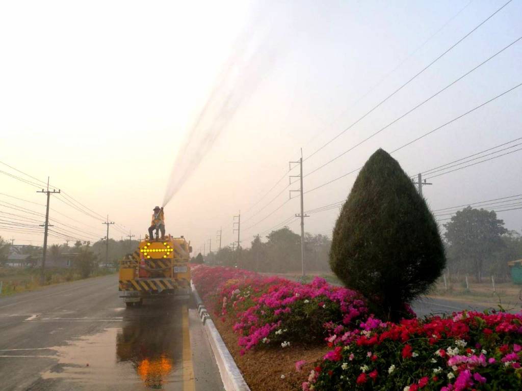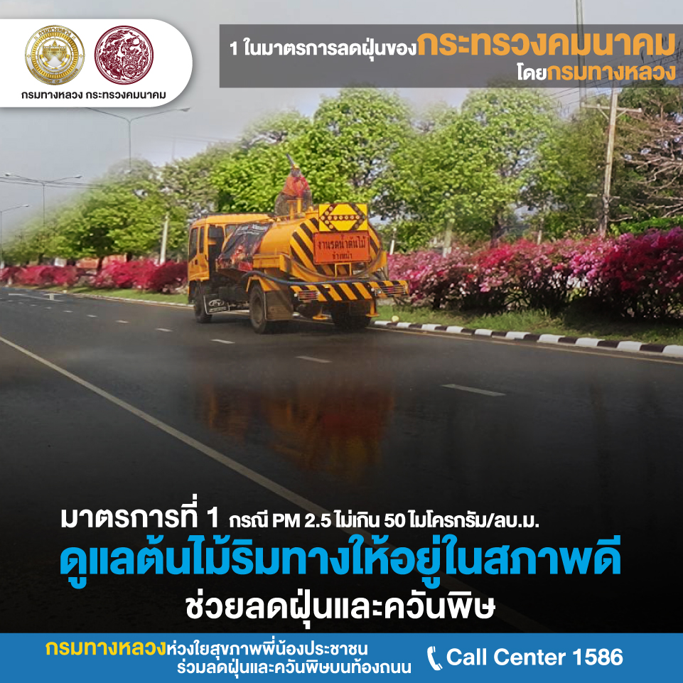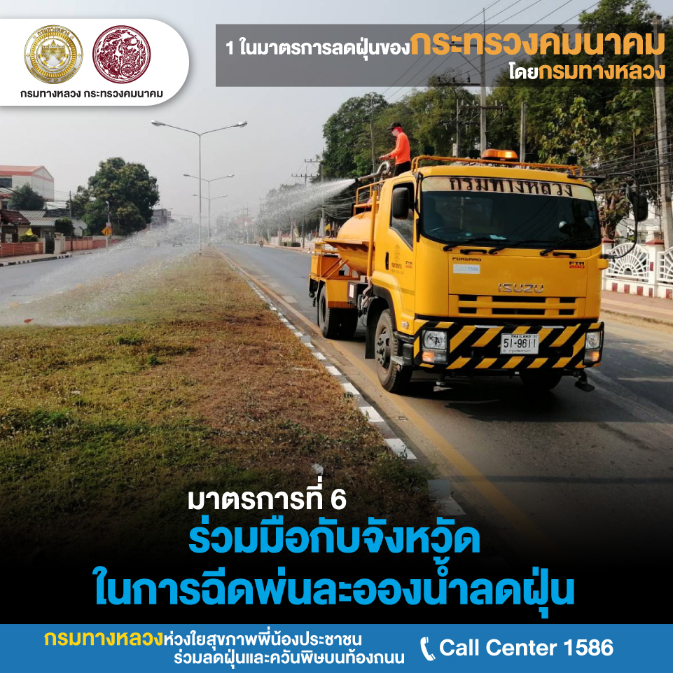 - มาตรการที่หก การประสานความร่วมมือกับจังหวัดในการฉีดพ่นละอองน้ำลดฝุ่น และการบำรุงรักษาต้นไม้ริมทางหลวงให้อยู่ในสภาพดี เพื่อช่วยจับฝุ่นละอองจากถนน