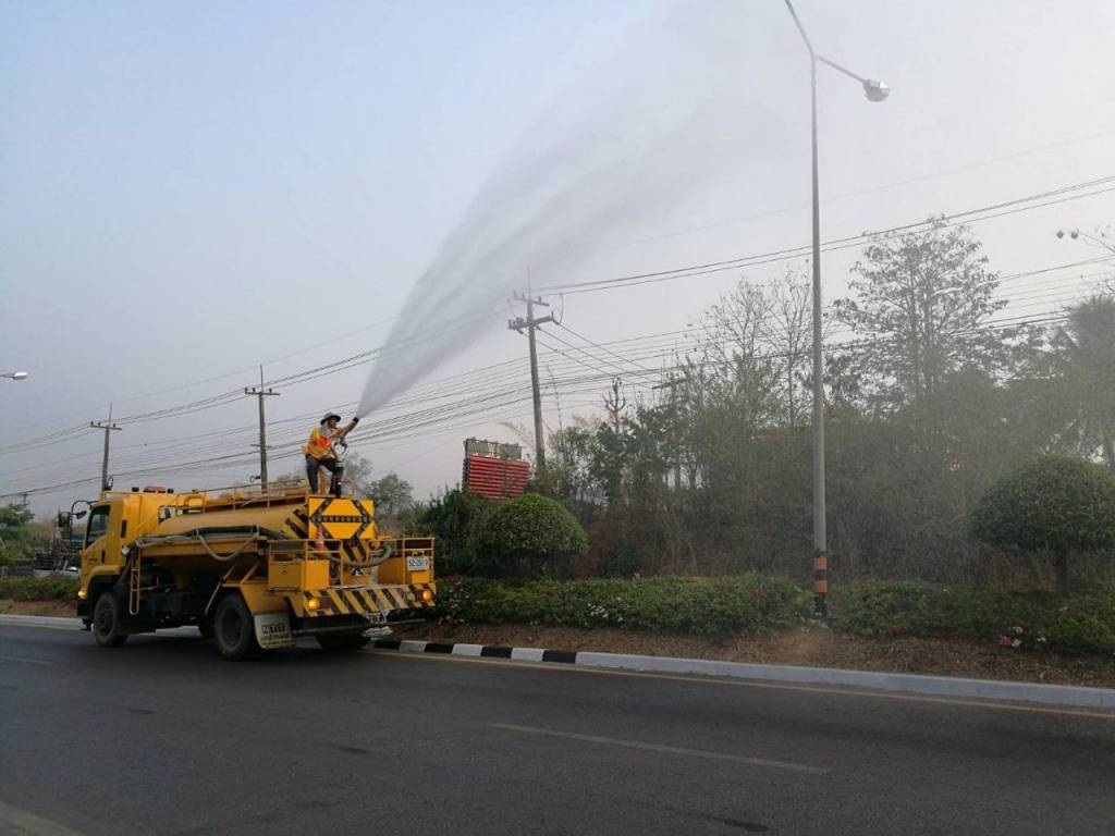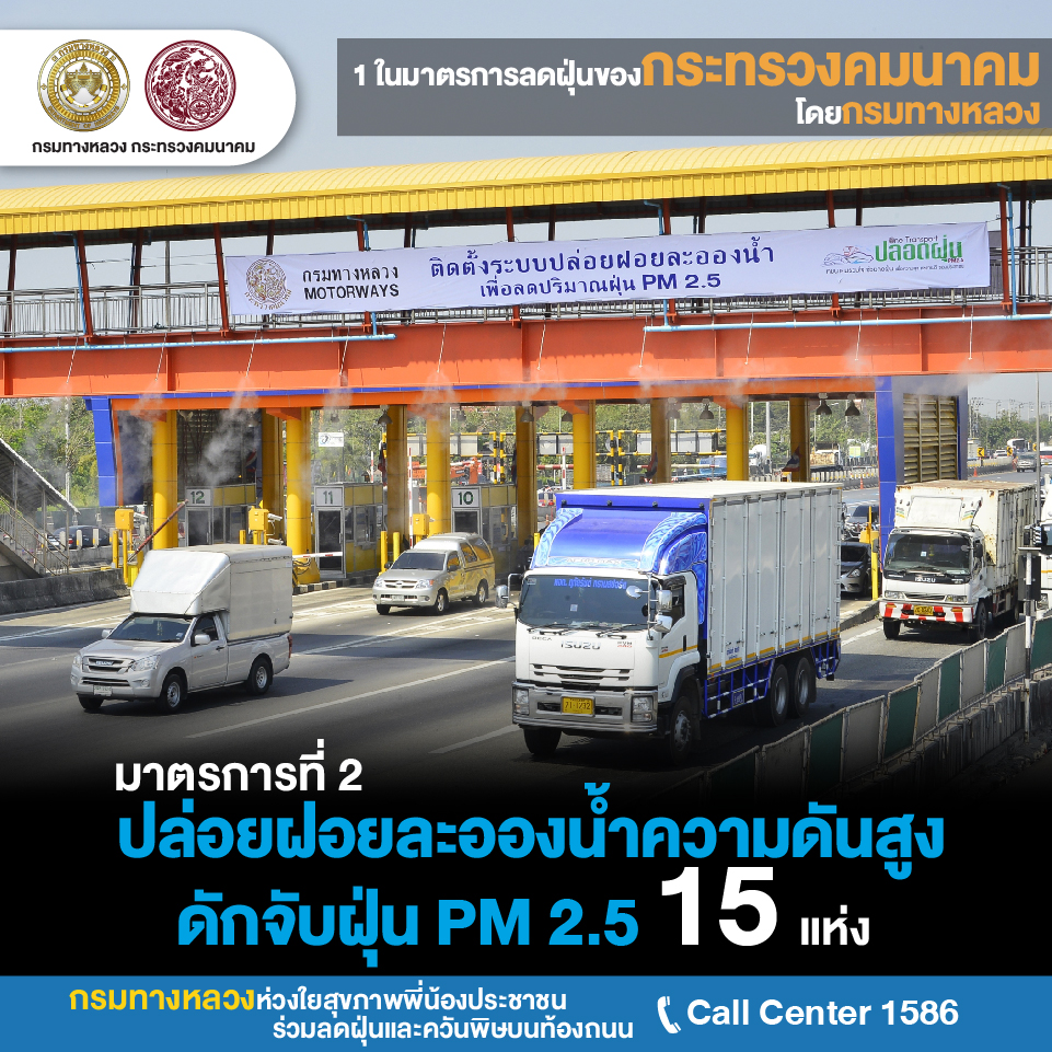 - มาตรการที่สอง กรมทางหลวงจะดำเนินการปล่อยฝอยละอองน้ำความดันสูง (High Pressure Water System) เพื่อดักจับฝุ่น ซึ่งปัจจุบันติดตั้งไว้จำนวน 15 แห่ง ดำเนินการช่วงเวลา 18.00-23.00 น. ณ บริเวณด่านเก็บค่าธรรมเนียมผ่านทางทับช้าง 1 มุ่งหน้าบางพลี 2 จุด, ด่านเก็บค่าธรรมเนียมผ่านทางทับช้าง 2 มุ่งหน้าบางปะอิน 2 จุด, มหาวิทยาลัยเกษตรศาสตร์ ฝั่งถนนวิภาวดีรังสิต, โรงเรียนหอวัง ฝั่งถนนวิภาวดีรังสิต, ถนนพระรามที่ 2 หน้าตลาดมารวย, ถนนพระรามที่ 2 ทางเข้าถนนบางกระดี่, ด่านเก็บค่าธรรมเนียมผ่านทางลาดกระบัง ขาเข้า, ด่านเก็บค่าธรรมเนียมผ่านทางลาดกระบัง ขาออก, ด่านเก็บค่าธรรมเนียมผ่านทางบางปะกง Type A, ด่านเก็บค่าธรรมเนียมผ่านทางหนองขาม 1, ด่านเก็บค่าธรรมเนียมผ่านทางหนองขาม 3, ด่านเก็บค่าธรรมเนียมผ่านทางโป่ง 3 และ ด่านเก็บค่าธรรมเนียมผ่านทางพัทยา ขาออก