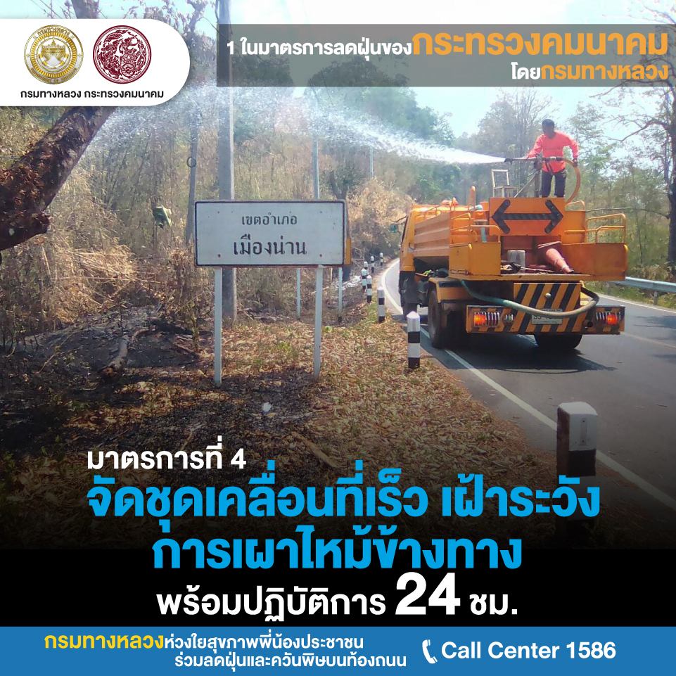 - มาตรการที่สี่ การเตรียมความพร้อมด้านบุคลากร และอุปกรณ์ในการป้องกันและควบคุมการเกิดปัญหาไฟไหม้ข้างทาง ตลอด 24 ชั่วโมง