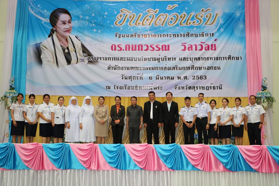สำหรับโรงเรียนเอกชนในจังหวัสุราษฎร์ธานี ประกอบด้วย โรงเรียนในระบบ รวมจำนวน 84 โรงเรียน นักเรียนจำนวน 43,894 คน ครูจำนวน 2,146 คน โรงเรียนนอกระบบ รวมจำนวน 169 โรงเรียน นักเรียนจำนวน 95,581 คน ครูจำนวน 4,596 คน โรงเรียนธิดาแม่พระ เป็นโรงเรียนเอกชนในระบบ ประเภทสามัญ สังกัด สำนักงานคณะกรรมการส่งเสริมการศึกษาเอกชน ตั้งอยู่เลขที่ 317/19 ถนนหน้าเมือง ตำบลตลาด อำเภอเมืองสุราษฎร์ธานี จังหวัดสุราษฎร์ธานี รหัสไปรษณีย์ 84000 เปิดสอนระดับชั้นเตรียมอนุบาลถึงมัธยมศึกษาปีที่ 6 มีนักเรียนจำนวน 5,854 คน บุคลากรทางการศึกษา จำนวน 344 คน