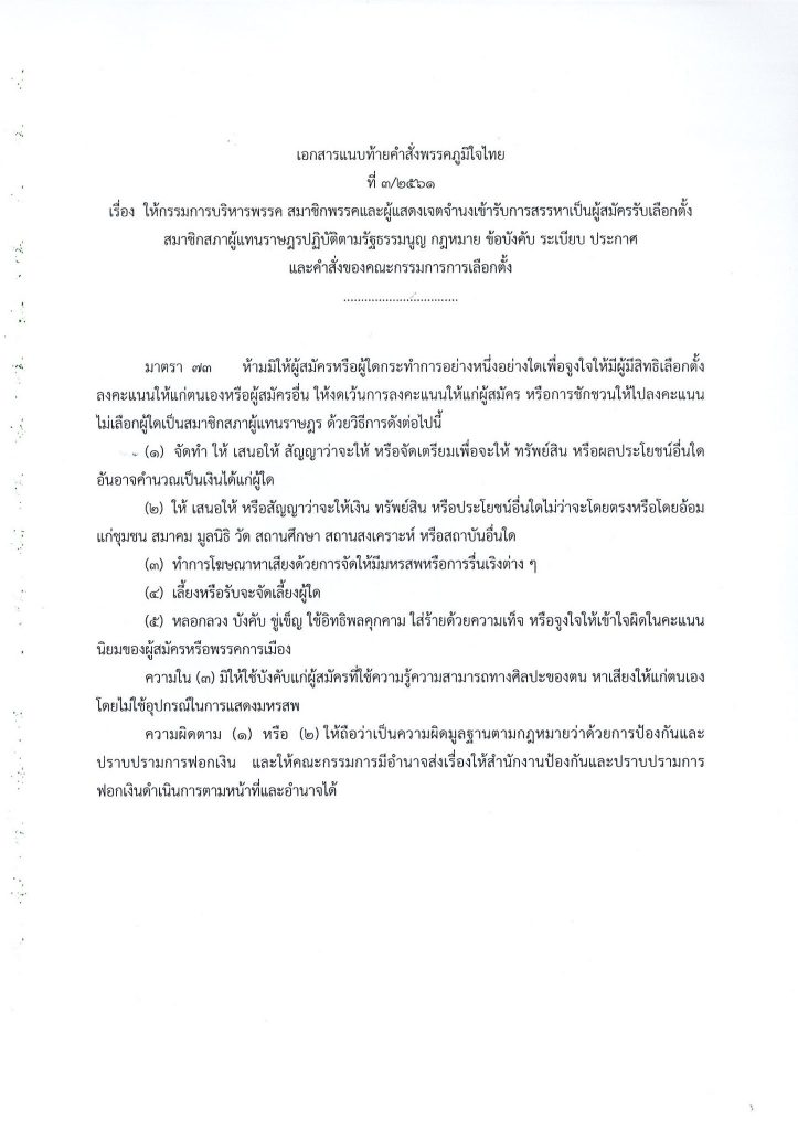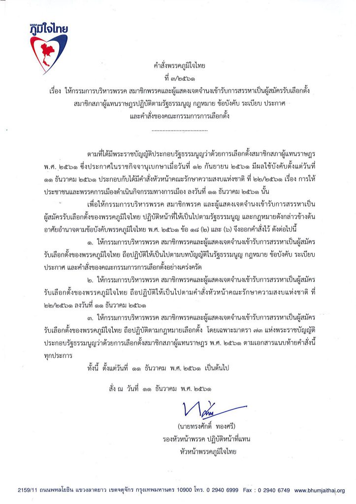 คำสั่งพรรคภูมิใจไทย ที่ 3/2561 ให้กรรมการบริหารพรรค สมาชิกพรรคและผู้แสดงเจตจำนงเข้ารับการสรรหาเป็นผู้สมัครรับเลือกตั้ง สมาชิกสภาผู้แทนราษฎรปฏิบัติตามรัฐธรรมนูญ กฎหมาย ข้อบังคับ ระเบียบ ประกาศและคำสั่งของคณะกรรมการการเลือกตั้ง