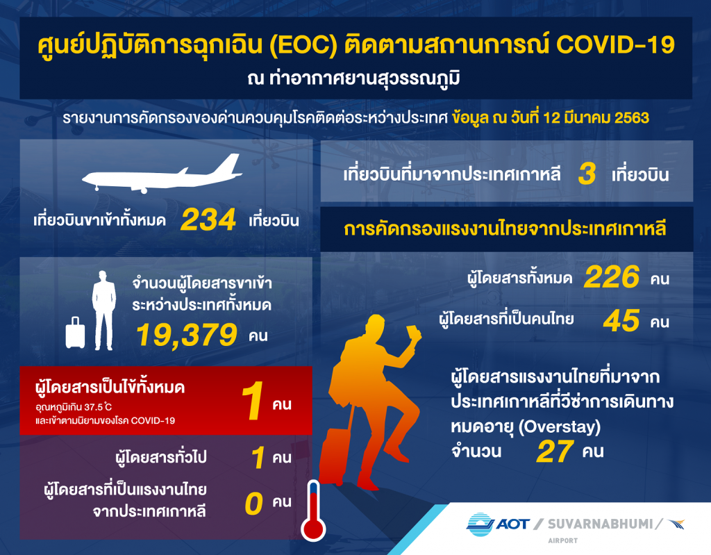 อนึ่ง ในวันที่ 12 มี.ค. 63 มีเที่ยวบินที่มาจากประเทศเกาหลี จำนวน 3 เที่ยวบิน (สายการบินไทย 1 เที่ยวบิน KOREAN AIRLINES 2 เที่ยวบิน) มีจำนวนผู้โดยสารทั้งสิ้น 226 คน โดยเป็นผู้โดยสารคนไทยจำนวน 45 คน ซึ่งในจำนวนนี้มีผู้โดยสารที่เป็นแรงงานไทยที่เดินทางมาจากประเทศเกาหลี ที่มีวีซ่าการเดินทางหมดอายุ (Overstay) จำนวน 27 คน