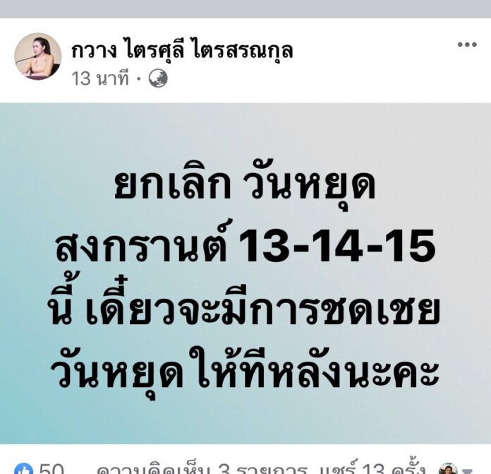ไตรศุลี โพสต์ยืนยัน! เลื่อนวันหยุดสงกรานต์ 13-14-15 เม.ย. ทำงานปกติ ชดเชยภายหลัง