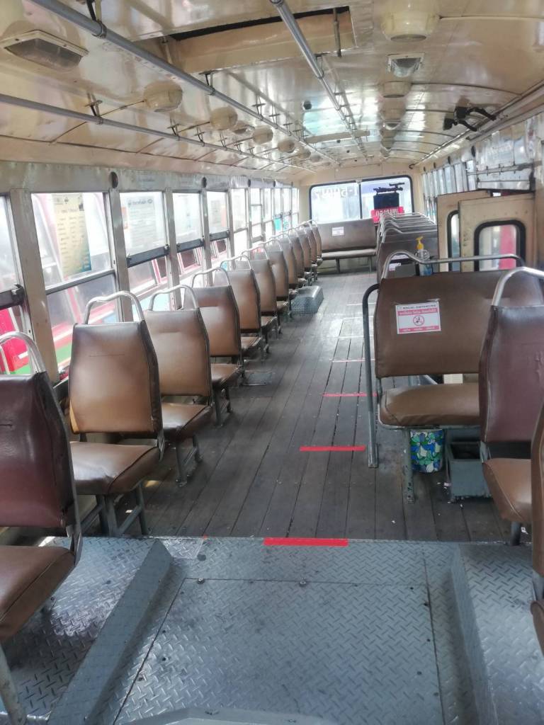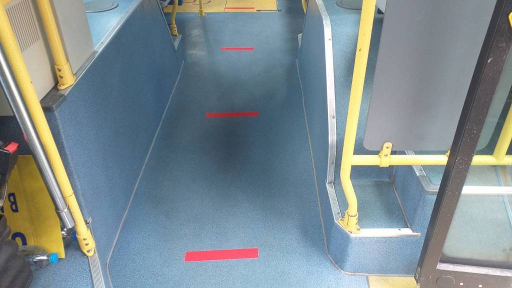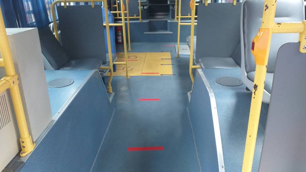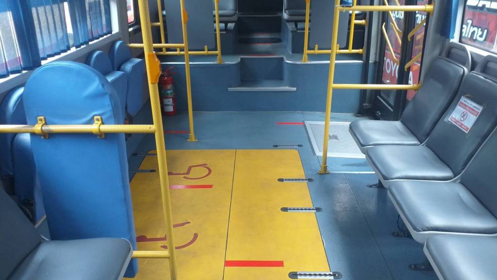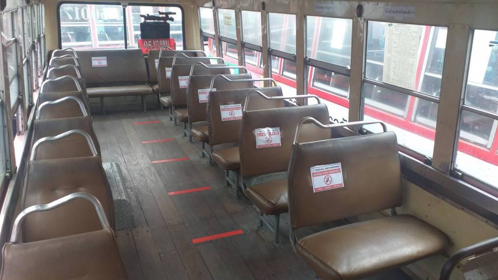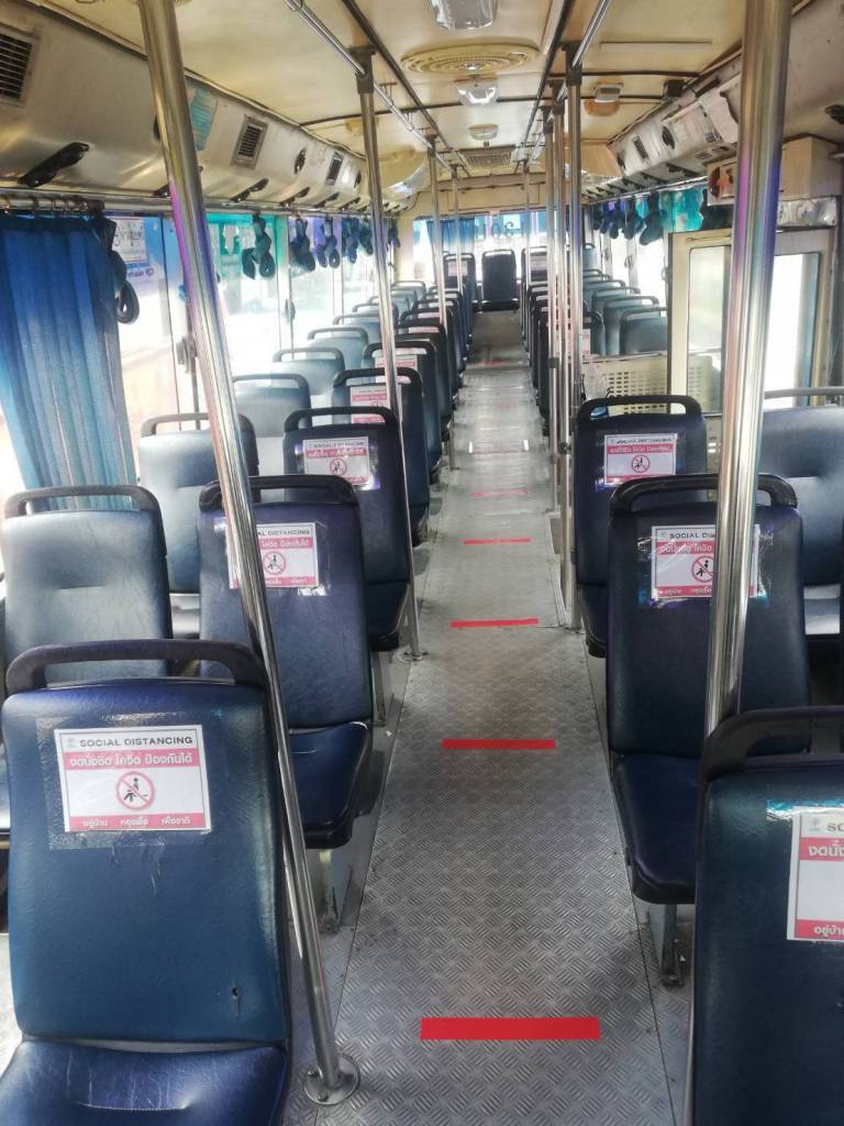 ที่นั่งบริเวณริมหน้าต่างเท่านั้น รวมทั้งได้กำหนดจุดยืนบนพื้นรถโดยสาร โดยเว้นระยะห่างกัน 1