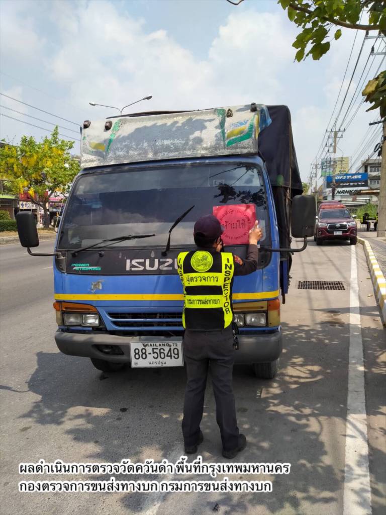 ในส่วนภูมิภาค สำนักงานขนส่งจังหวัด 15 จังหวัดที่เป็นเส้นทางเข้าสู่กรุงเทพมหานคร ได้แก่ สำนักงานขนส่งจังหวัดสมุทรสาคร สมุทรสงคราม นครปฐม ราชบุรี เพชรบุรี นนทบุรี ปทุมธานี พระนครศรีอยุธยา นครนายก สมุทรปราการ ชลบุรี ฉะเชิงเทรา อ่างทอง สระบุรี และ สุพรรณบุรี ตรวจวัดควันดำ จำนวน 396 คัน พบรถที่มีค่าควันดำเกินเกณฑ์มาตรฐานที่ราชการกำหนด 1 คัน ออกใบแจ้งเตือน 1 คัน ในส่วนสำนักงานขนส่งจังหวัดอื่น 61 จังหวัด ตรวจวัดควันดำ จำนวน 683 คัน ไม่พบควันดำเกินมาตรฐาน แต่ออกใบเตือน จำนวน 197 คัน ทั้งนี้ ส่งผลให้มียอดสะสมตั้งแต่วันที่ 1 ตุลาคม 2562 – 30 มีนาคม 2563 ตรวจรถทั้งสิ้น 235,541 คัน เป็นพบรถที่มีค่าควันดำเกินเกณฑ์มาตรฐานที่ราชการกำหนด พ่นห้ามใช้ จำนวน 3,575 คัน ซึ่งผู้ประกอบการเจ้าของรถได้ดำเนินการแก้ไขปรับปรุงและนำเข้าตรวจสภาพเรียบร้อยแล้ว จำนวน 2,272 คัน