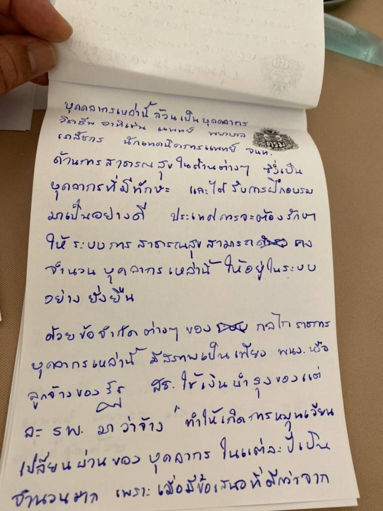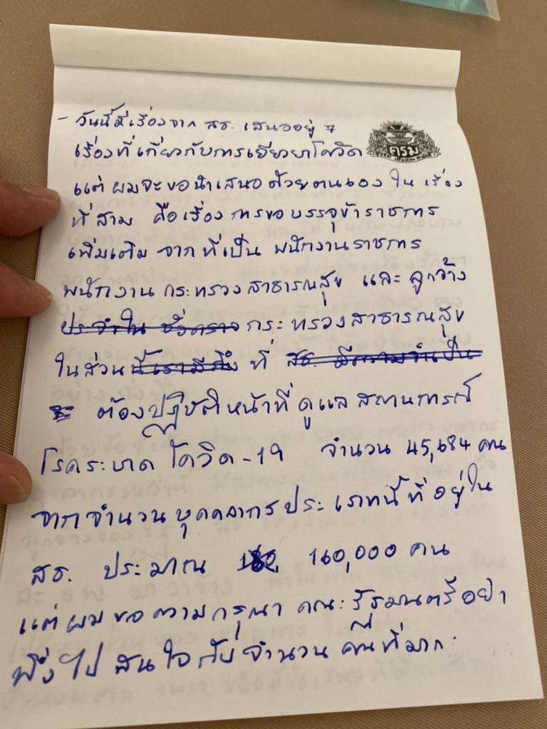 3 เมษายน 2563 เวลา 14:43เผย "อนุทิน" จดยิก คิดละเอียด ก่อนเสนอกลางที่ประชุม ครม. ให้ พนักงาน สธ. เป็น ขรก.ย้ำ สร้างขวัญ กำลังใจคนทำงาน สุดท้ายผ่านฉลุยจากกรณีที่ที่ประชุม ครม.เห็นชอบในหลักการที่นายอนุทิน ชาญวีรกูล รองนายกรัฐมนตรี และรัฐมนตรีว่าการกระทรวงสาธารณสุข เสนอให้พนักงานกระทรวงสาธารณสุข กว่า 4 หมื่นตำแหน่ง ได้บรรจุ เป็นข้าราชการ ผู้สิ่อข่าวรายงานว่า ก่อนการประชุม นายอนุทิน ได้เตรียมเสนอมาอย่างดี โดยจดรายละเอียดในสิ่งที่เตรียมจะเสนอ ครม.ไว้ในกระดาษหลายแผ่น เนื้อหามีดังนี้ " วันนี้มีเรื่องของกระทรวงสาธารณสุขอยู่ 7 เรื่องที่เกี่ยวกับการเยียวยาโควิด 19 แต่ผมจะขอนำเสนอด้วยตนเองในเรื่องที่ 3 คืนเรื่องการขอบรรจุข้าราชการเพิ่มเติม จากที่เป็นพนักงานราชการ พนักงานกระทรวงสาธารณสุข และลูกจ้างกระทรวงสาธารณสุข ในส่วนนี้ ที่ต้องปฏิบัติหน้าที่ดูแลสถานการณ์ จำนวน 45,684 คน จากบุคลากรประเภทนี้ที่อยู่ในกระทรวงสาธารณสุขประมาณ 160,000 คน แต่ผมขอความกรุณา คณะรัฐมนตรีอย่าเพิ่งไปสนใจเรื่องจำนวน บุคลากรเหล่านี้ ล้วนเป็นบุคลากรวิชาชีพ อาทิเช่น แพทย์พยาบาล เภสัชกร นักเทคนิคการแพทย์ เป็นบุคลากรที่มีทักษะ และได้รับการอบรมเป็นอย่างดี ประเทศจะต้องรักษา ให้ระบบสาธารณสุข คงจำนวนบุคลากรเหล่านี้ ให้อยู่ในระบบอย่างยั่งยืน แต่ด้วยข้อจำกัดต่างๆของกลไกราชการ บุคลากรเหล่านี้ มีสภาพเป็นเพียงพนักงานหรือลูกจ้างของรัฐ กระทรวงสาธารณสุข ใช้เงินบำรุง ของแต่ละโรงพยาบาล มาว่าจ้าง ทำให้เกิดการหมุนเวียนเปลี่ยนผ่านของบุคลากรในแต่ละปีเป็นจำนวนมาก เพราะเมื่อมีข้อสนอที่ดีกว่าจากภาคส่วนอื่นๆ เขาก็ต้องไปทำงาน ในที่ที่มีรายได้มากกว่า ทั้งที่ต้นทุนในการฝึกฝนทักษะ รัฐเป็นผู้ลงทุนไว้ เมื่อมีสถานการณ์โรค Covid-19 ในครั้งนี้ เราได้เห็นความทุ่มเท เสียสละ และความมุ่งมั่น ของบุคลากรสาธารณสุขเหล่านี้ ที่เข้าไปต่อสู่ รักษา ป้องกัน อย่างสุดความสามารถ ที่จะทำใก้เกิดความปลอดภัยแก่คนในชาติ โดยเฉพาะผู้ป่วยที่ติดเชื้อ ซึ่งมีการยืนยันแล้วว่า โรคโควิด นอกจากจะคร่าชีวิตผู้ป่วยจำนวนมากแล้ว ยังเป็นโรคที่คร่าชีวิตบุคลากร สธ. มากที่สุดด้วย การปรับสถานะให้เขามีความมั่นคงในอาชีพการงาน จะทำให้คุณภาพของการบริการผู้ป่วยได้รับการยกระดับอย่างชัดเจน เรื่องนี้ เป็นเรื่องที่ค้างคามานานต้องใช้อำนาจในการบริหารเท่านั้น ที่จะยกระดับคุณภาพชีวิตของเขาได้ บุคคลเหล่านี้เป็นผู้เชี่ยวชาญชำนาญเฉพาะทาง เป็นสายอาชีพ ที่นำเสนอมานี้ไม่ใช่เป็นการขออัตราเพิ่ม แต่เป็