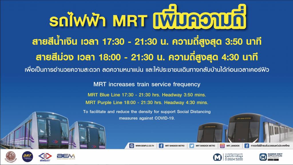 รฟม. และ BEM รับนโยบาย “ศักดิ์สยาม ชิดชอบ” รัฐมนตรีว่าการกระทรวงคมนาคม เพิ่มขบวนรถไฟฟ้า MRT ในชั่วโมงเร่งด่วนเย็น ตามมาตรการ Social Distancing พร้อมอำนวยความสะดวกผู้โดยสารเดินทางกลับเข้าเคหสถานก่อนเคอร์ฟิว ตามนโยบายกระทรวงคมนาคม