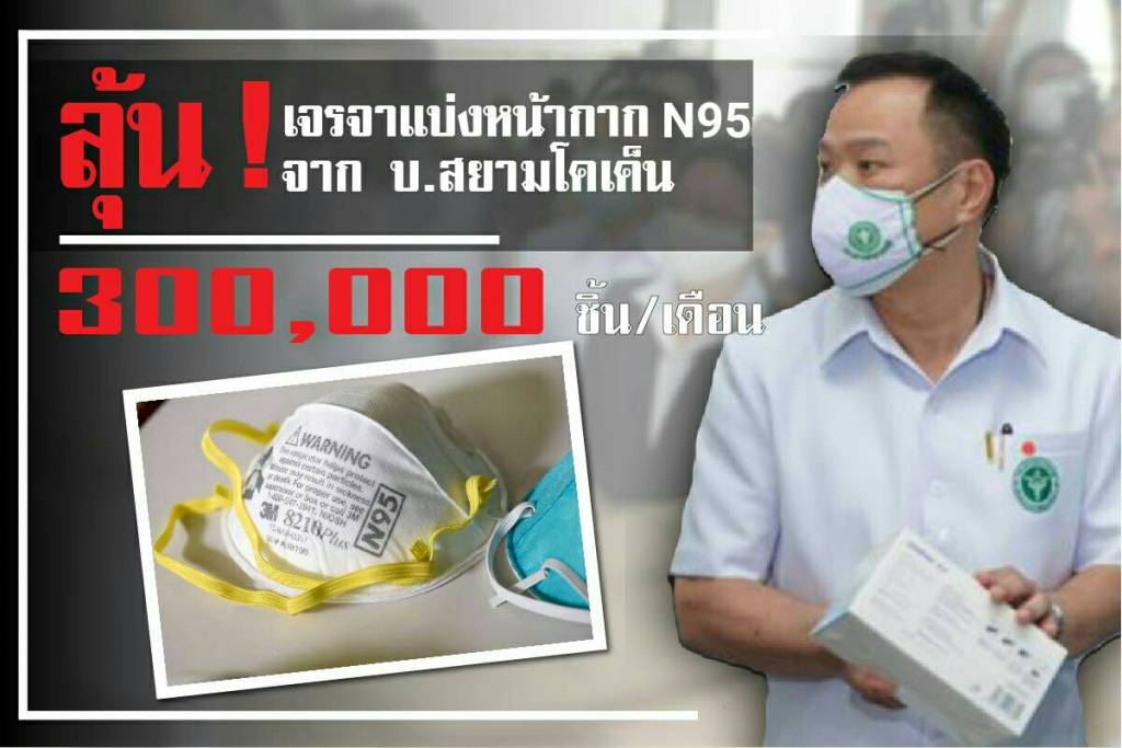 นพ.โสภณ เมฆธน ประธานคณะกรรมการองค์การเภสัชกรรม (บอร์ด อภ.) เปิดเผยความคืบหน้าการจัดหาอุปกรณ์ทางการแพทย์สำหรับการควบคุม ป้องกันการแพร่ระบาดของโรคติดเชื้อไวรัสโคโรนา 2019 (Covid-19) ว่าในส่วนของหน้ากากอนามัย N95 ขณะนี้ นายอนุทิน ชาญวีรกูล รองนายกรัฐมนตรี และรัฐมนตรีว่าการกระทรวงสาธารณสุข ได้พยายามเจรจา ขอแบ่งหน้ากาก N95 จาก บริษัท สยาม โคเค็น จำกัด เป็น 50% หลังจากที่เจรจาขอแบ่งสำเร็จแล้ว 40 %