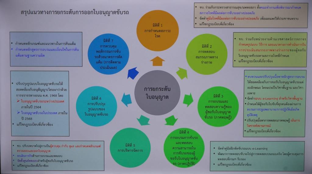 1.การกำหนดสภาวะโรค ซึ่ง ขบ.จะต้องไปดำเนินการตรวจโรคจากแพทย์สภาให้เป็นมาตรฐานในการออกใบรับรองแพทย์ ให้ผู้ที่จะขอใบอนุญาตขับขี่ จะต้องไม่มีโรคต้องห้าม ซึ่งในอนาคตเตรียมนำระบบออนไลน์มาประยุกต์ใช้ ก่อนที่จะมีการออก FIR for Drive ต่อไป