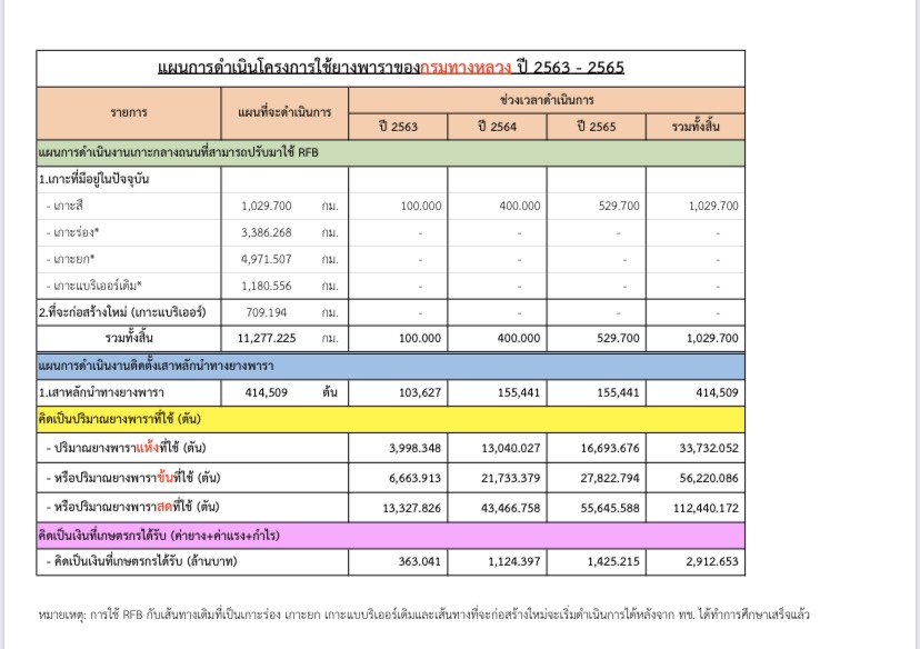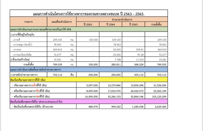 โดยระยะเวลา 3 ปี ทล. และ ทช. จะต้องนำยางพารามาใช้ในถนนจำนวน 12,306.925 กม. รวมใช้ยาง 336,000 ตัน เนื่องจาก 1 เมตร จะใช้น้ำยางพารา 28 กก. หรือ 28 ตัน/ 1 กม. และใช้งบประมาณถูกกว่าการก่อสร้างแบบริเออร์ประเภทอื่นด้วย ซึ่งจากข้อมูลของ ทล. ให้ข้อมูลว่า ถ้าทำแผ่นยางฯ จะใช้งบประมาณเพียง 7 ล้านบาท/1 กม. ประหยัดกว่าการก่อสร้างเกาะถนนประเภทอื่น 30% หรือใช้งบ 10 ล้านบาท/1 กม.