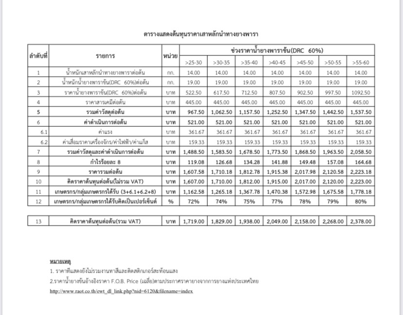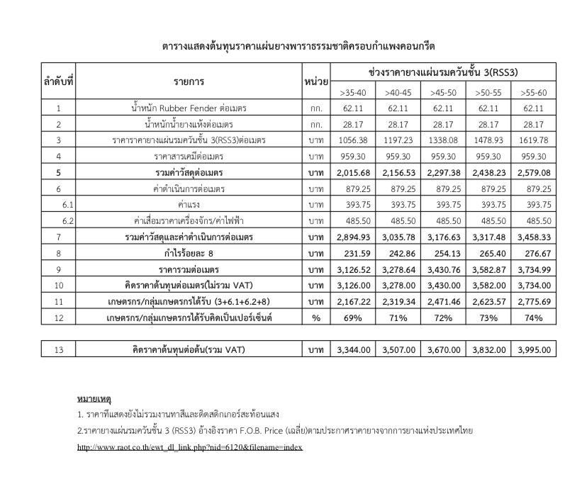 ในส่วนของต้นทุนในการก่อสร้างนั้น แบริเออร์คอนกรีตอบเดิมราคาอยู่ที่ 3,000 กว่าบาท และแผ่นยางพาราหุ้มแบริเออร์ราคาอยู่ที่ 3,344 บาท (กรณีราคายาง กก. ละ 35-40 บาท) รวมราคาไม่เกิน 7,000 บาท/ 1 เมตร เงินจะถึงเกษตรกร 2,167.22 บาท/ 1 เมตร หรือคิดเป็น 69% กรณีราคายาง กก.ละ 55-60 บาท ต้นทุนแผ่นยางพาราหุ้มแบริเออร์จะอยู่ที่ 3,995 บาท โดยเงินจะถึงเกษตรกร 2,775.69 บาท/ 1 เมตร หรือคิดเป็น 74% ต่างจากในอดีตที่นำยางพารามาใช้ในการปูพื้นทาง เงินถึงเกษตรกรเพียง 13 บาทเท่า หรือคิดเป็นไม่ถึง 20%
