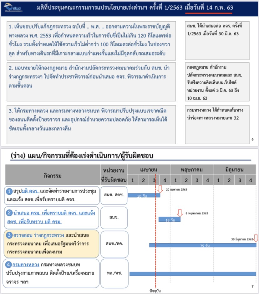 “เรื่องของการออกกฎกระทรวงได้วางไทม์ไลน์ไว้อย่างชัดเจน จะดำเนินการให้เสร็จสิ้นภายในเดือนมิถุนายน 2563 เมื่อประกาศกฎกระทรวงออกมาแล้ว จะมีการประกาศใช้ได้แต่ละเส้นทาง ขอย้ำว่าไม่ได้ประกาศให้สามารถใช้ความเร็วได้ 120 กิโลเมตรต่อชั่วโมงทุกเส้นทาง จะต้องประกาศเฉพาะถนนที่มีความปลอดภัยแล้วเท่านั้น” นายศักดิ์สยาม กล่าว